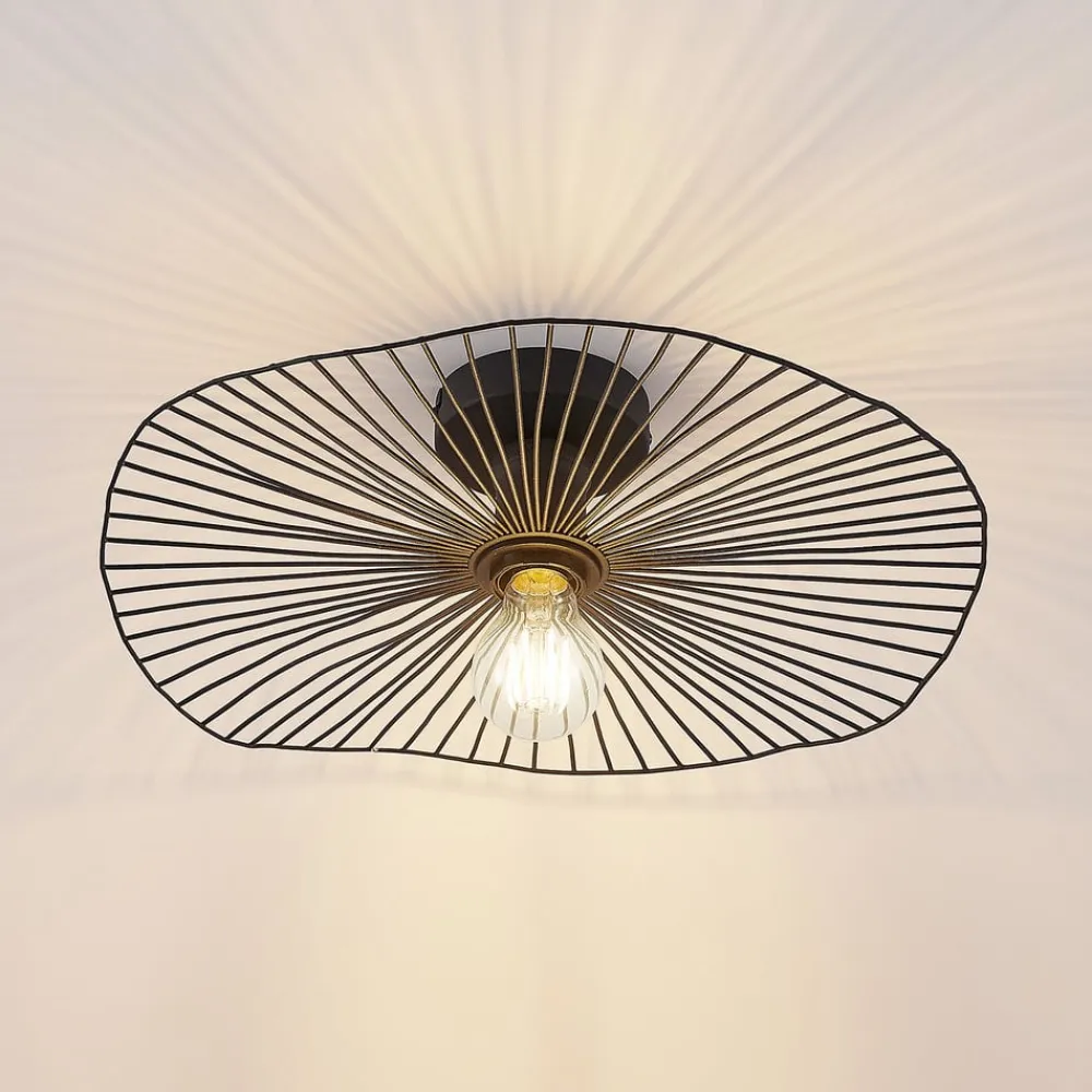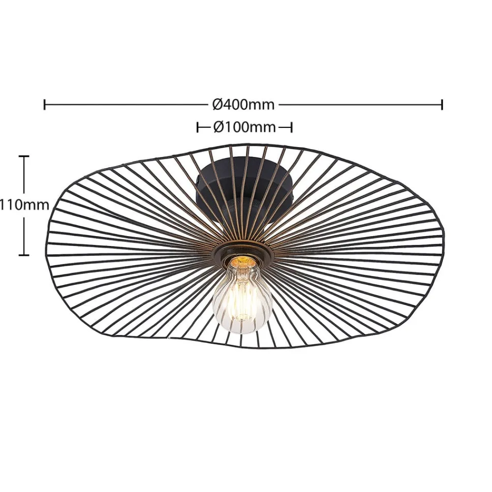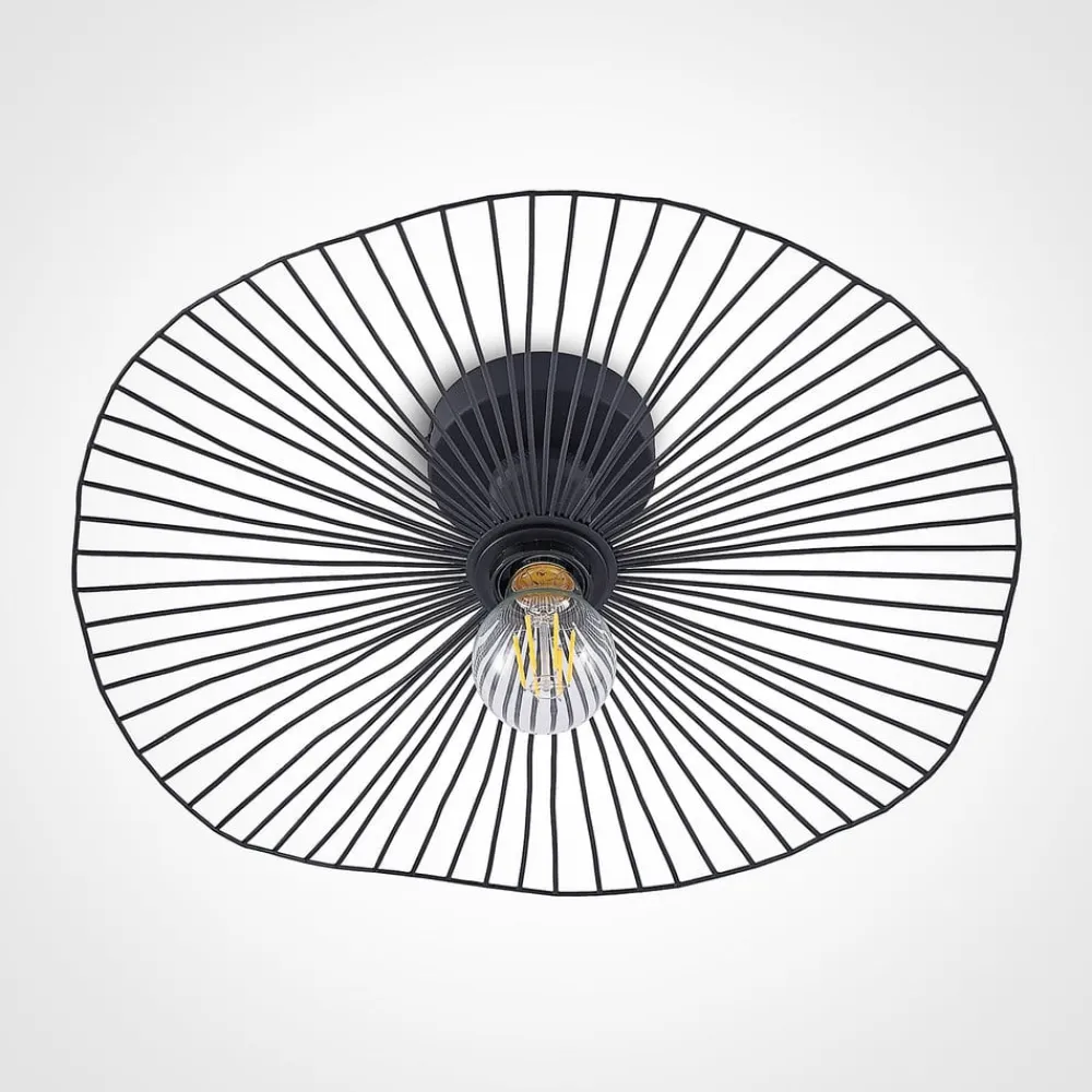 Ruota- loftlampe design ligner lidt en krøllet solhat. Skærmen, der er formet næsten som et egerhjul, men bølget, er lavet af metal og er malet i mat sort. fatning til lampen, der stikker nedad fra lampen, er placeret i midten af dette hjul.