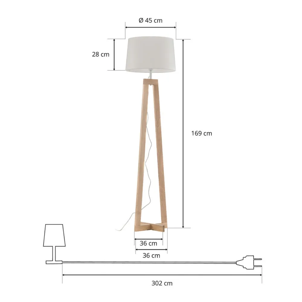 Den charmerende Sacha gulvlampe skaber en hyggelig atmosfære takket være sin tekstilskærm Sacha gulvlampe er en sofistikeret belysningsløsning i et trendy skandinavisk design. Den diskrete lampefod er lavet af træ og har en korsform. Dette giver armaturet ikke kun et interessant udseende, men også et stabilt standpunkt. To bjælker mødes i en trekantet form og slutter under den klassisk designede lampeskærm. Den cylindriske skærm er lavet af et let chintzstof, som er kendt for sin holdbarhed. Den særlige tekstur sikrer en blød lysfordeling, hvilket gør Sacha ideel til soveværelset.