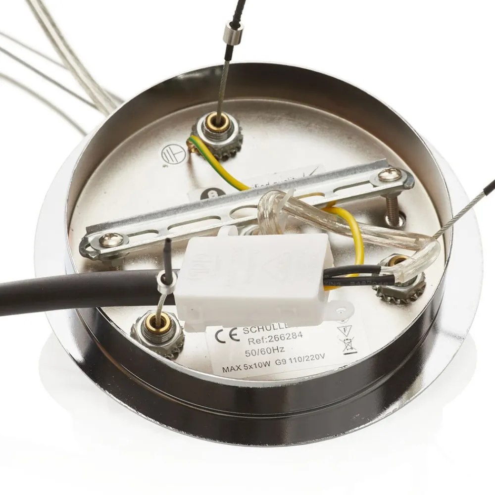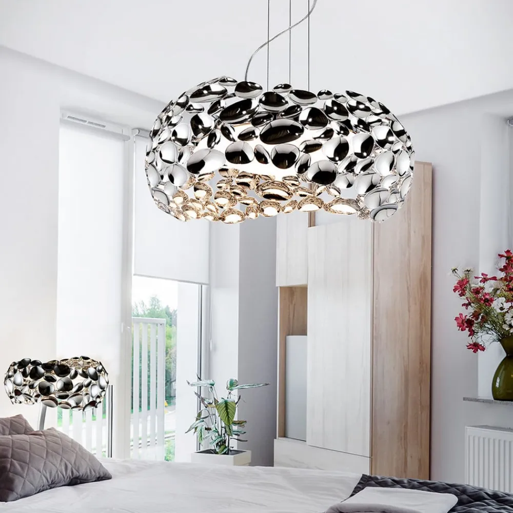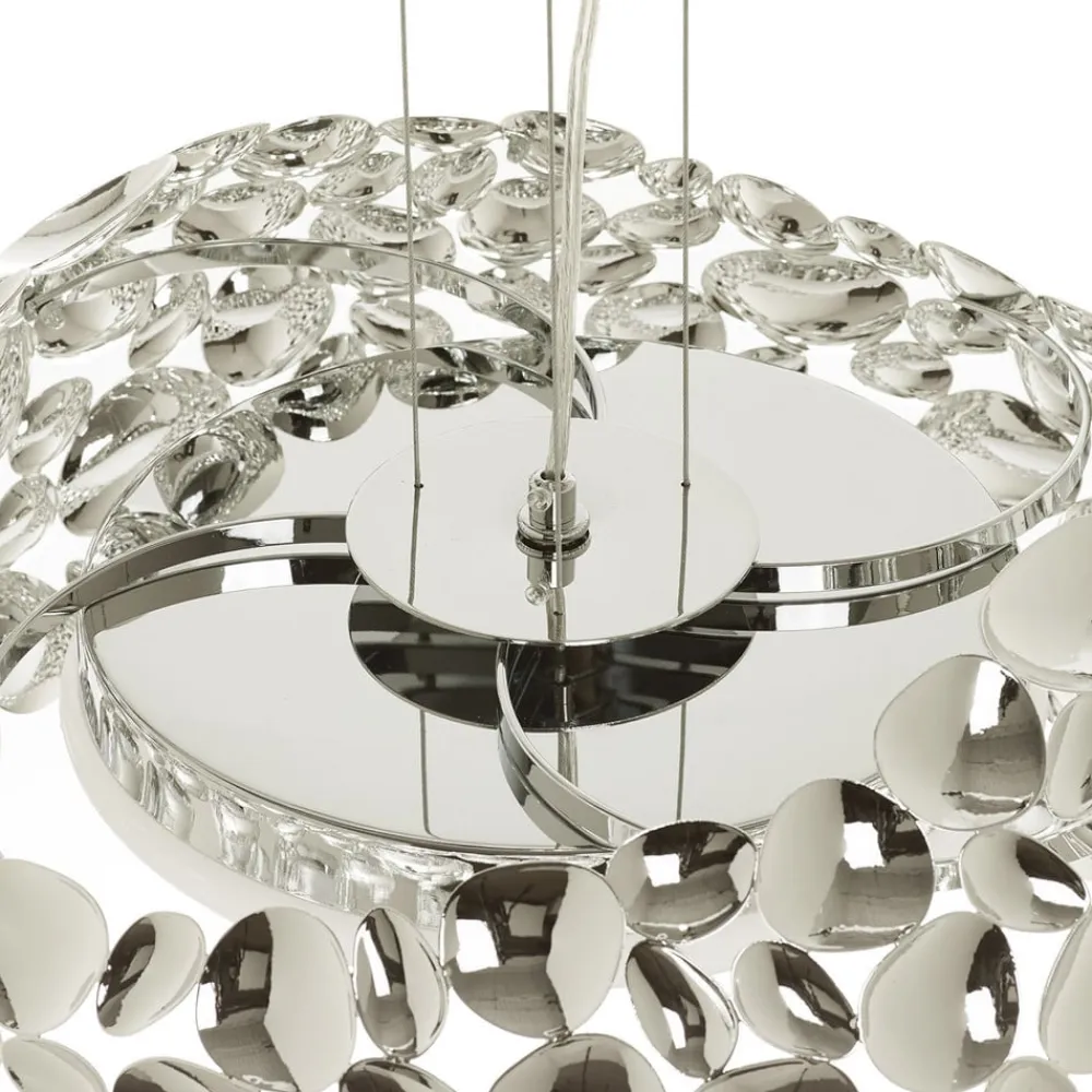 Uregelmæssigt formede, hovedsageligt ovale metalelementer med forkromet overflade er hos LED-hængelampen Narisa placeret efter hinanden på række for at danne en usædvanligt formet lampeskærm. På den måde opstår der en fortryllende konstruktion, der – i lige gyldigt hvilket rum – bliver til midtpunktet. Pærerne sidder bag en diffusor af hvid akryl. Dermed formår de at afgive et jævnt fordelt lys nedad, mens de utallige mellemrum i skærmen og spejlingerne af lyset i de bølgende elementer hele vejen rundt får flotte lyseffekter til at opstå på vægge og indretningsgenstande.