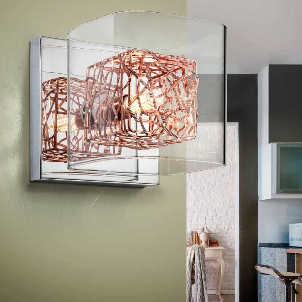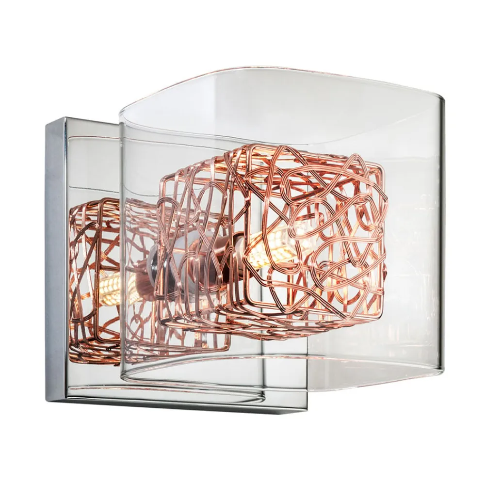 Lyskilde og kunstobjekt på samme tid: Lios LED-væglampe Lios LED-væglampen med sin indvendige skærm af kobbersnore er en meget speciel lyskilde til stemningsfuld ekstra belysning og samtidig et dekorativt møbeltilbehør. Den ydre skærm er lavet af klart glas. Vægbeslaget er forkromet, så den dobbelte skærm spejler sig i det. Lios leveres med en LED-lyskilde med G9-fatning.