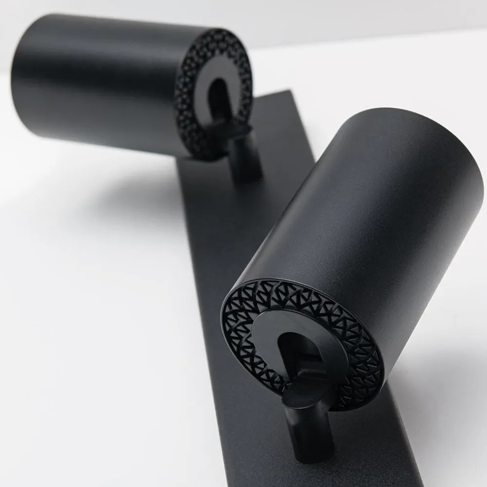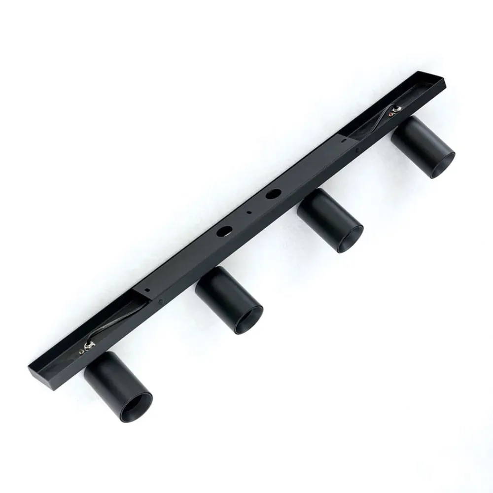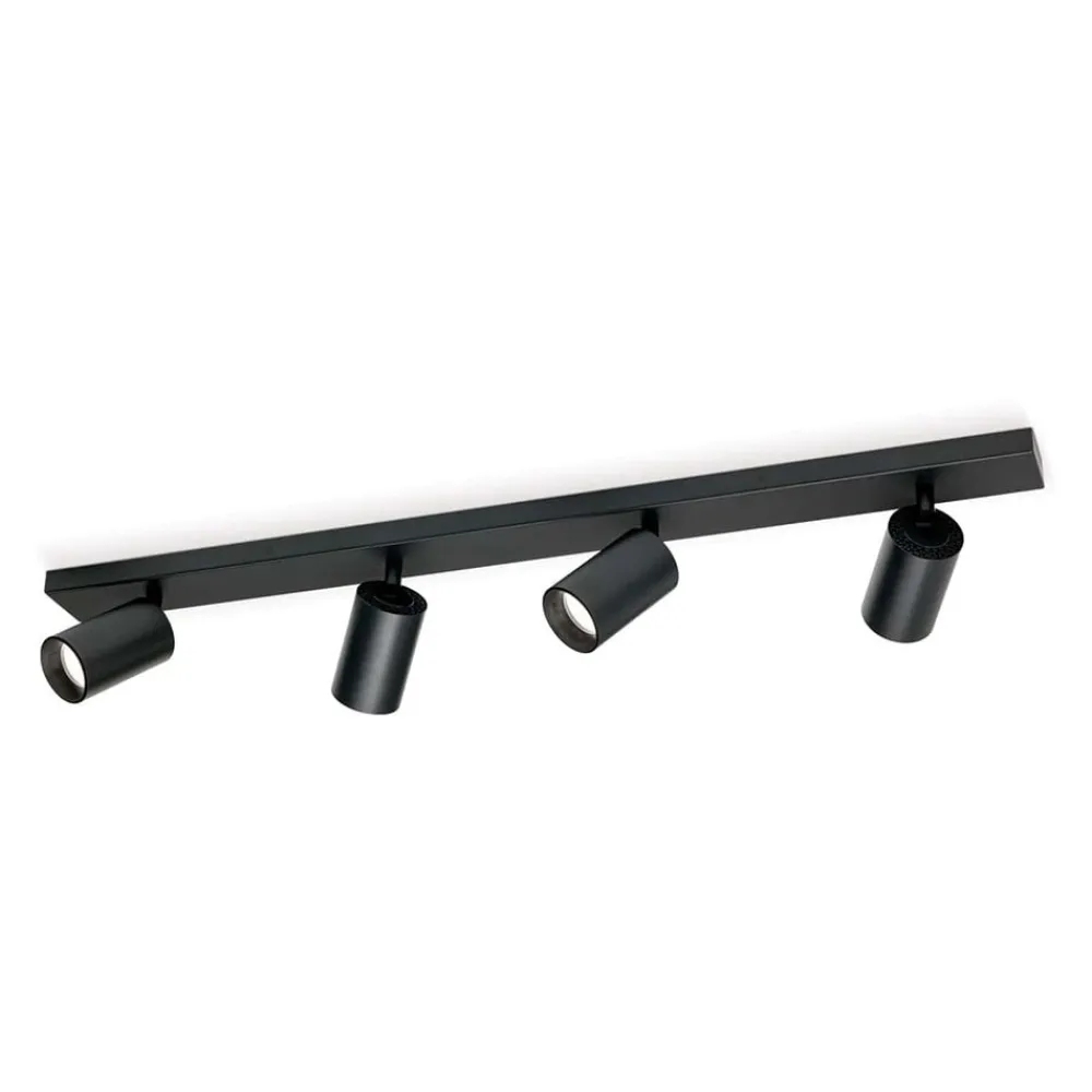 De fire lyskilder er monteret side om side i træk på den smalle, langstrakte baldakin . Den matsorte overflade og de få detaljer gør rampelyset til et iøjnefaldende, diskret belysningselement, som alligevel er moderne og praktisk. De fire lyskilder kan drejes og drejes efter behov, hvilket sikrer optimal justering af lysstrålen. Objekter og områder kan belyses direkte og specifikt efter behov.