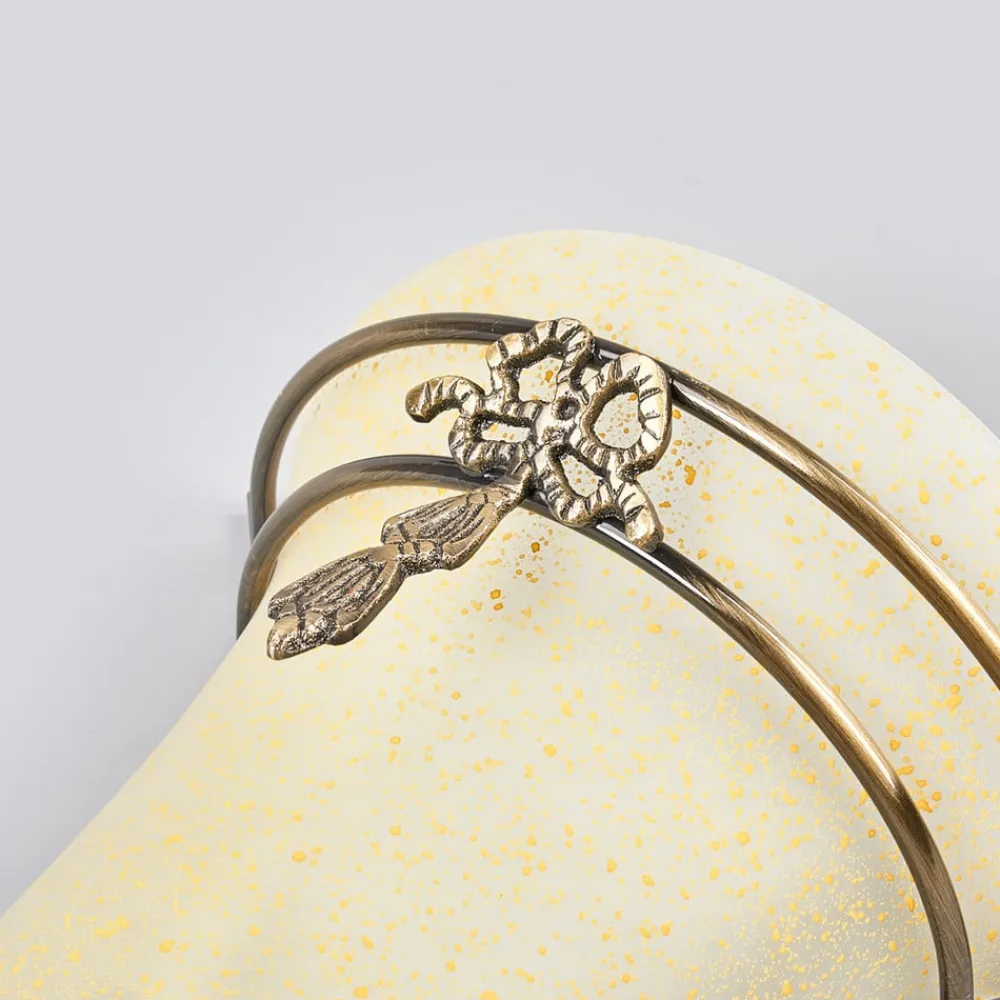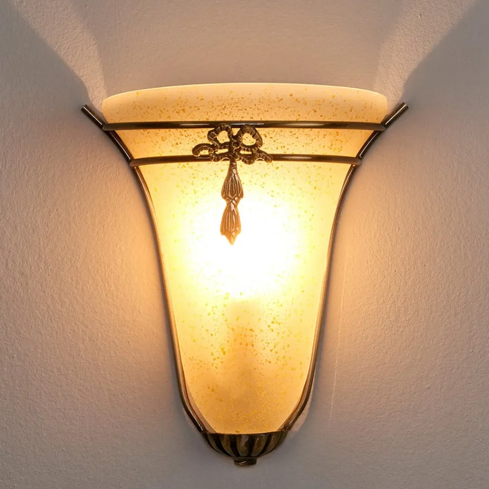 ASCANA væglampen fremstår med et tiltalende design med cremefarvet scavoglas, der har et diskret, stænkmønster. Smalle, bronzefarvede metalelementer fuldstændiggør det klassiske look, så det fremstår antikt. På grund af glasskærmens varme nuancer skaber væglampen en behagelig ekstra belysning og understreger en behagelig atmosfære.
