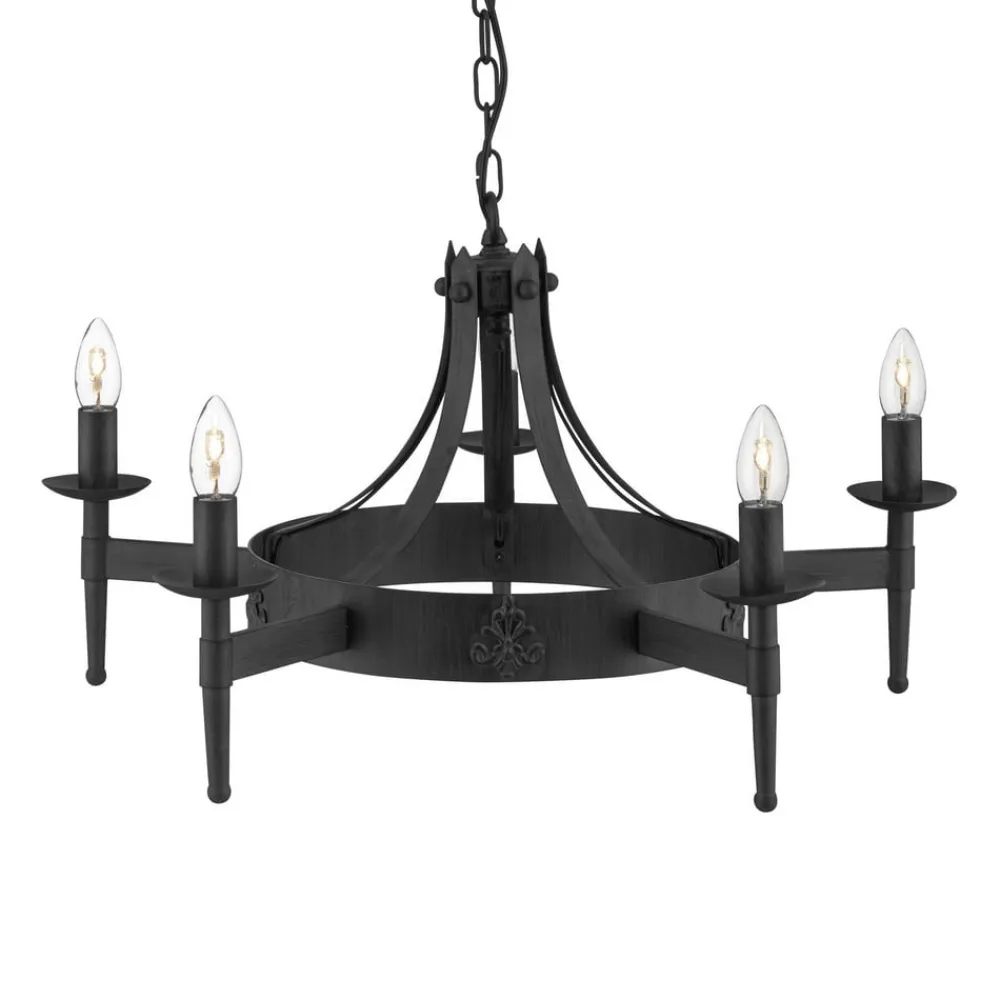 Denne fem-lys lysekrone ser ud til at stamme fra middelalderen, da designet er baseret på den gamle engelske stil. På Cartwheel II’s smedejernsramme er der i alt fem fatninger fordelt, en i midten og fire på den ydre ring. Et tilbehør i en antik indretningsstil, udstyret med moderne belysningsteknologi, som er fremragende egnet til grundbelysning i stuen og i entréer. Den rustikke kædeophængning forstærker det antikke design.