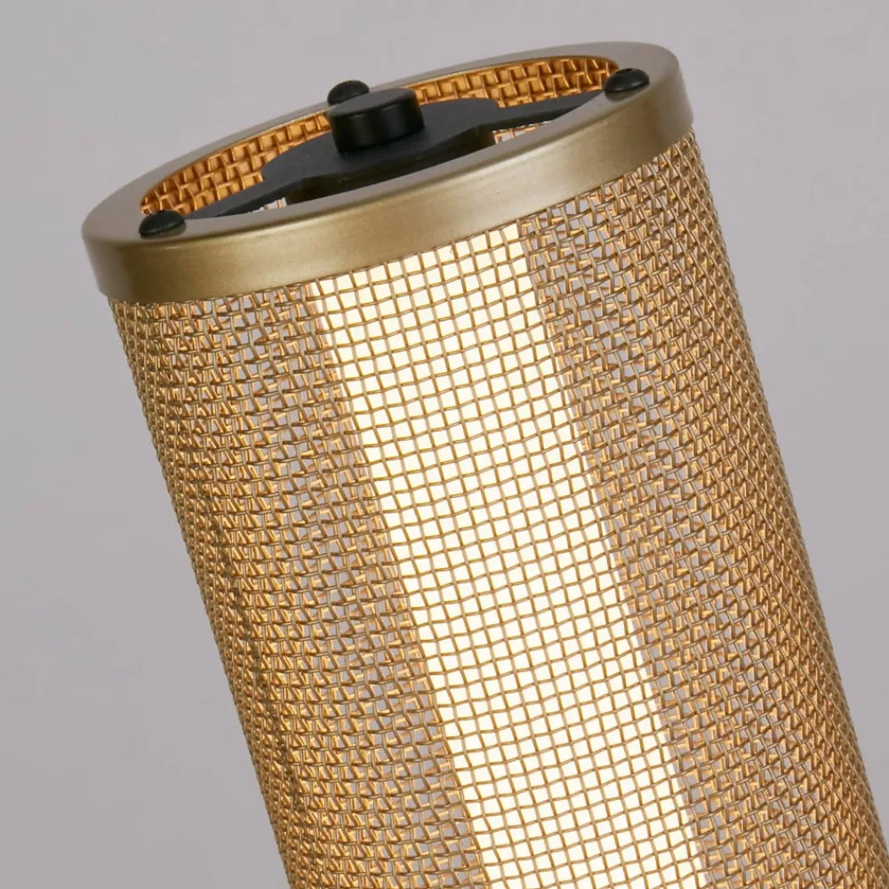 Thread LED-gulvlampe med gylden netskærm, dæmpbar i 3 trin Thread er en moderne LED-gulvlampe, der kombinerer slankt design med funktionalitet. Med en matsort basis og en gylden netskærm, der skaber forskellige mønstre, når den er oplyst, er den et blikfang i rummet på trods af sit slanke design. Lampen kan ikke kun tændes og slukkes ved hjælp af fodkontakten i kablet, den kan også indstilles til tre lysstyrkeniveauer.