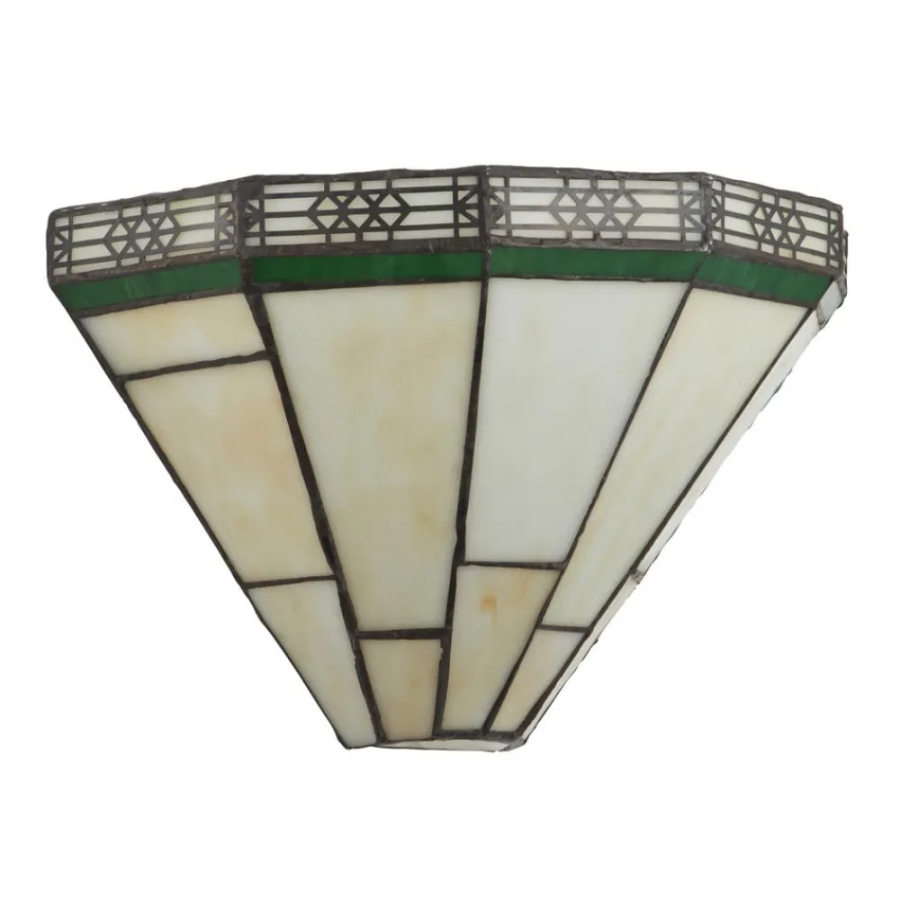 Væglampe New York med skærm lavet i Tiffany-teknikDen håndlavede skærm på væglampen New York er designet med et elegant mønster i Tiffany-stil i farverne creme og grøn, som kommer effektivt til sin ret, når belysningen er tændt. Denne smukke lyskilde giver stemningsfuld accentbelysning til stuer og soveværelser samt korridorer og gange.