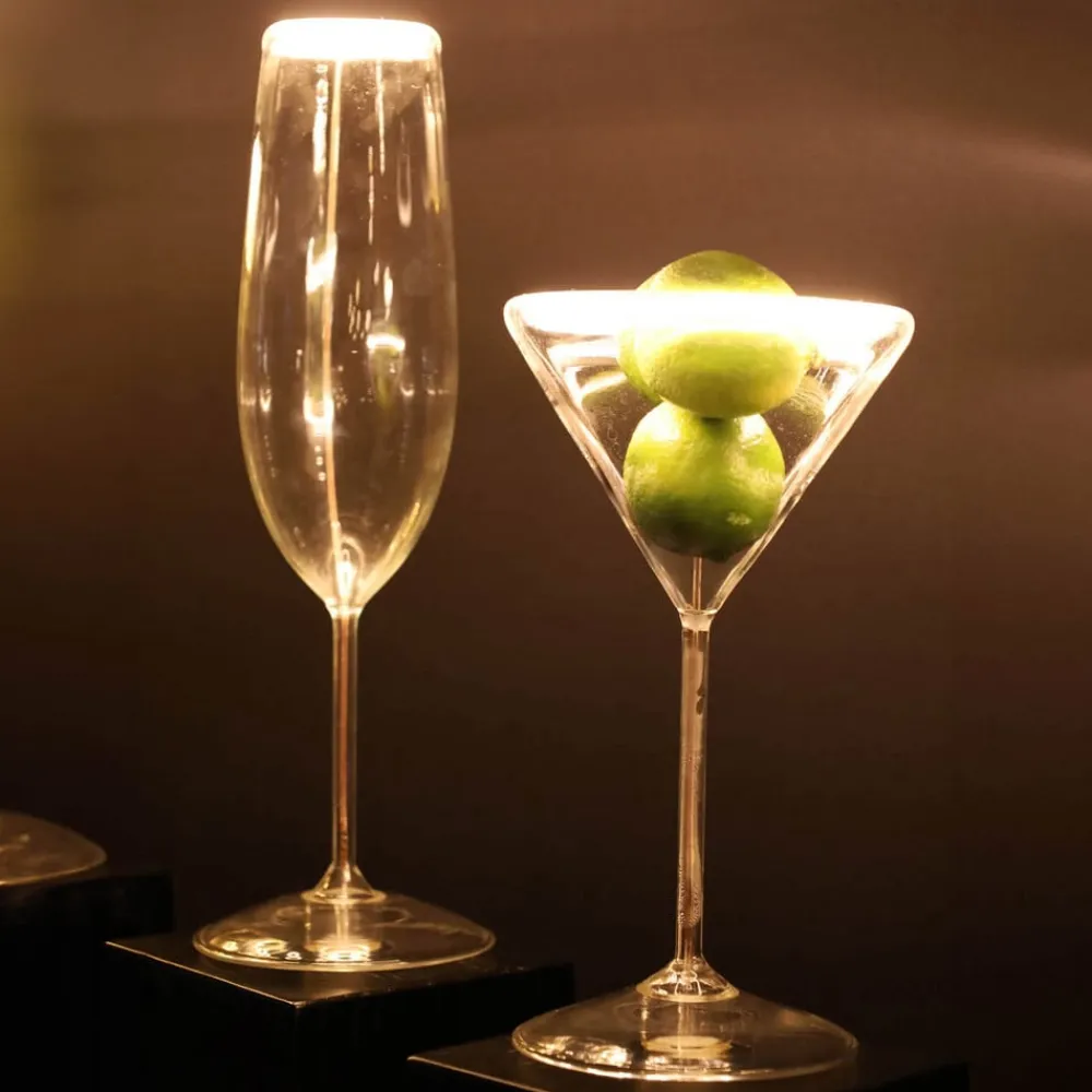 E27 LED-pære Floating Martini, 6 W – klar glaspære Denne E27 LED-pære fra Floating-serien er udstyret med en klar glaspære, hvis form er modelleret efter et martini-glas. Den patenterede soft filament-teknologi og attraktive lysrefleksioner giver pæren ekstra dekorativ værdi. Ideel til åbne armaturer uden skærm eller fatningsarmaturer – eksternt dæmpbar (bagkant) – ekstra varmhvidt lys – god farvegengivelse (CRI 90) – håndlavet glaskugle