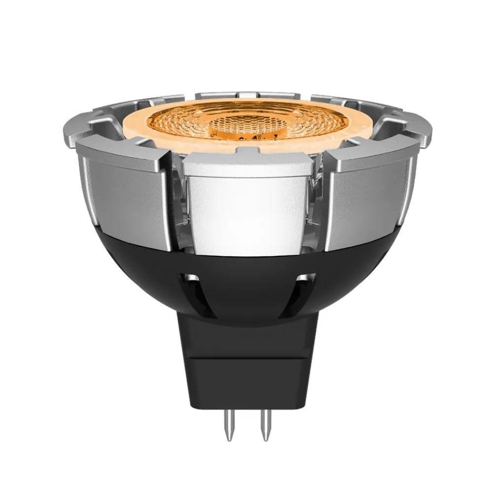 LED-reflektor GU5.3 7W sort/krom med omgivelsesdæmpning, 12 V Denne LED-reflektorpære GU5.3 med sort bund og skinnende sølvhoved med gennemsigtigt dæksel er en energieffektiv erstatning for halogenreflektorer på mange områder. LED-reflektorpæren, som kan dæmpes med de fleste standarddæmpere, skifter lysfarve i takt med dæmpningen takket være ambient dimming. Fra 3.000 K varmhvid bliver lyset stadig varmere, når man dæmper ned til 2.000 K. – 40° udstrålingsvinkel – dæmpbar med de fleste gængse lysdæmpere – særlig lang holdbarhed på antal tænd/sluk med 100.000 koblingscyklusser – lavspændingslyskilde (12 V AC/DC)