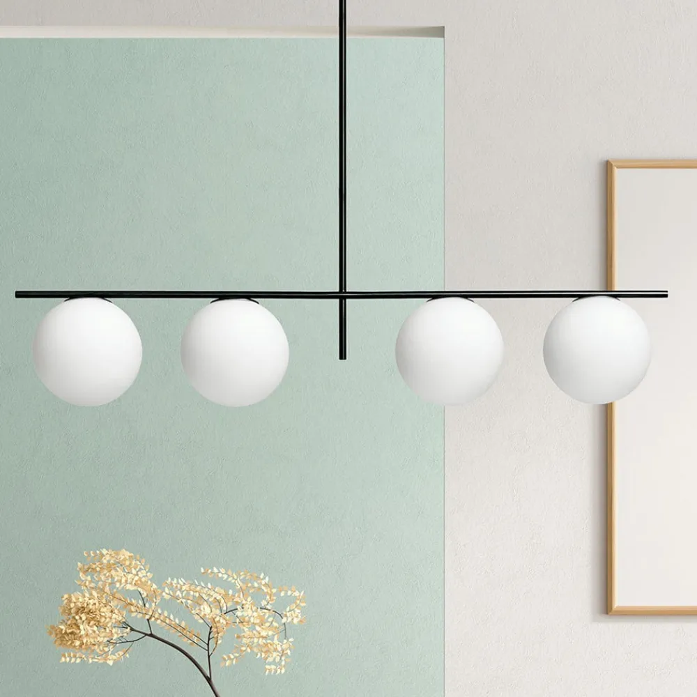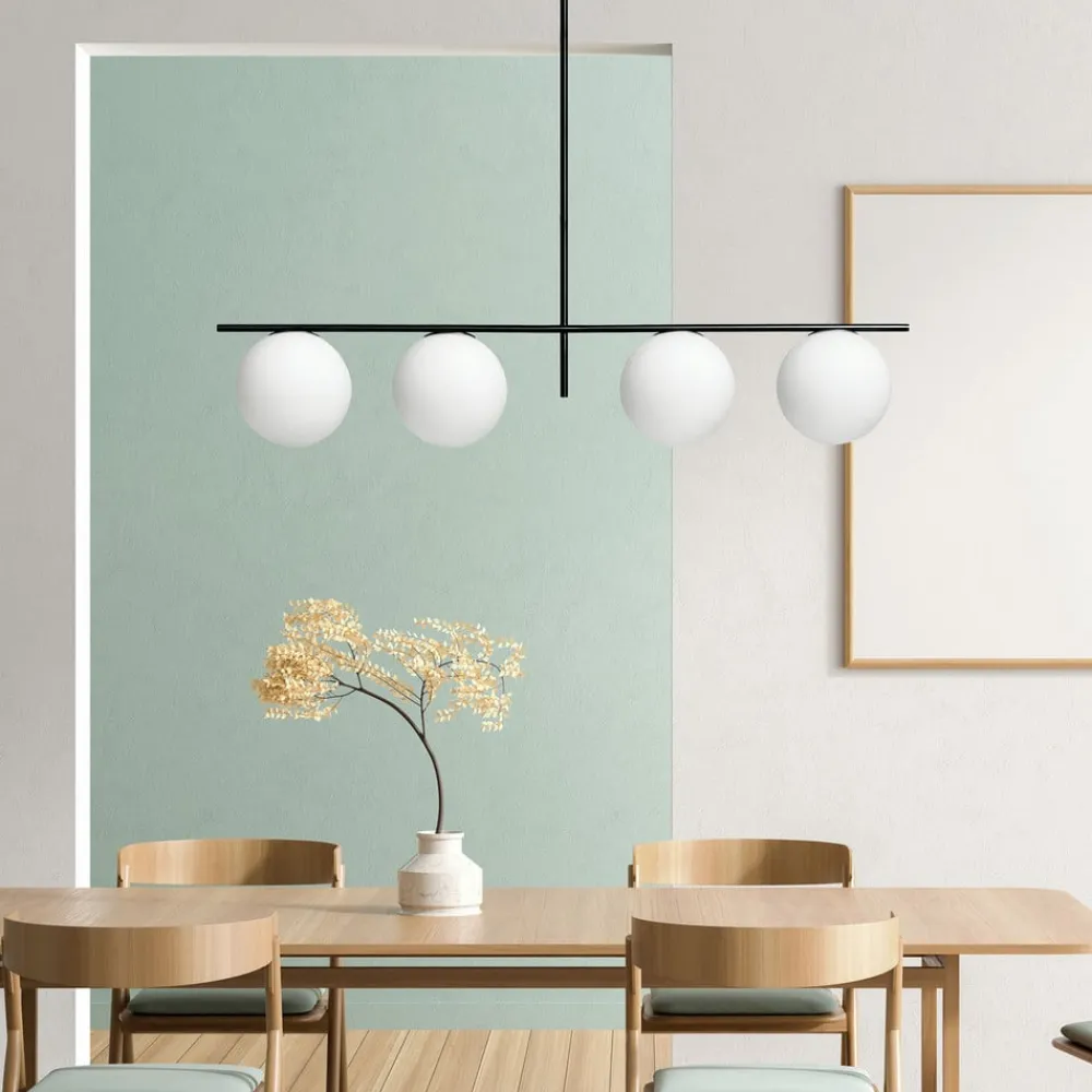 Fire-lys pendellampe Jugen med justerbar ophængForm af pendellampen Jugen er velegnet til brug i en spisestue over bordet. Lampens ophæng kan justeres i to størrelser under monteringen, da lampen har to rør i forskellige længder, som nemt kan sættes sammen. Stellet er sortlakeret, stivt bearbejdet og udstyret med fire kugleformede skærme, der er rettet nedad. Skærmene er lavet af hvidt glas og står i kontrast til den sorte stang. Pendellampens farvesammensætning og design er tidløst og skaber en smuk stemning.Denne lampe kommer fra produktserien Miloox fra Sforzin, som er kendetegnet ved et usædvanligt friskt design og kombinationen af trendy materialer.