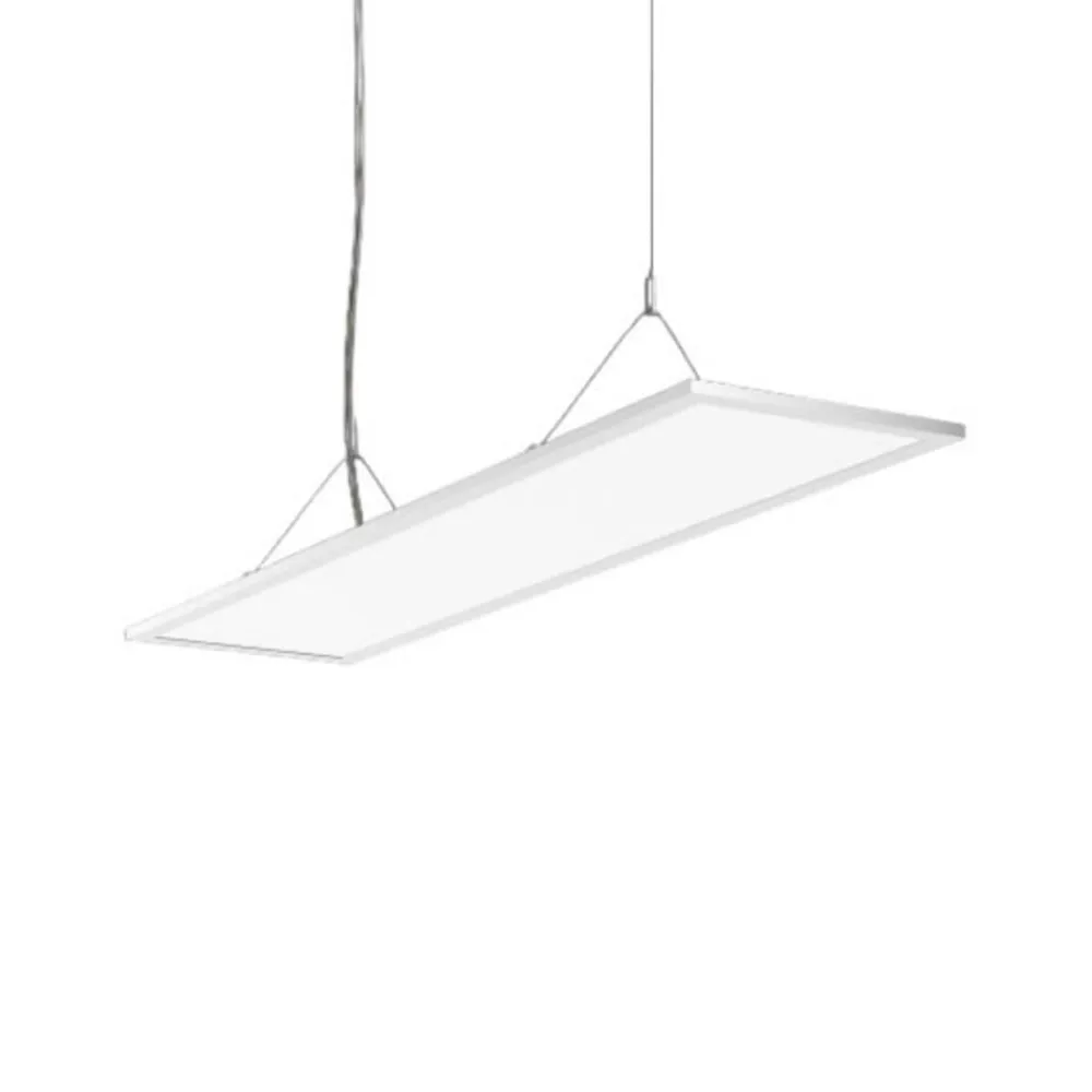 LED-pendellampe Sidelite ECO med mikroprismatisk afskærmning er ideel til kontorlokaler og er i henhold til DIN EN 12464-1 også velegnet til arbejdspladser med skærm. Med denne lampe kan man skabe en lysverden i kontor- eller konferencerum og mange andre områder, som ikke kunne være mere økonomisk og progressiv. Hængelampen giver et ekstraordinært klart og homogent lys, som den skylder RZB-Sidelight-teknologien. Lampekroppen forsynes med lys fra siden, hvilket genererer et højkvalitets, usædvanligt jævnt og klart lys. Den er meget flad og virker næsten svævende i rummet takket være den filigrane 2-punkts stålkabelsophængning. Multilumen: Lysstrøm for lampen kan indstilles i fire trin ved hjælp af to små kontakter på lampen. Lampen er fra fabrikken forindstillet til den højeste lysstrøm for lampen.