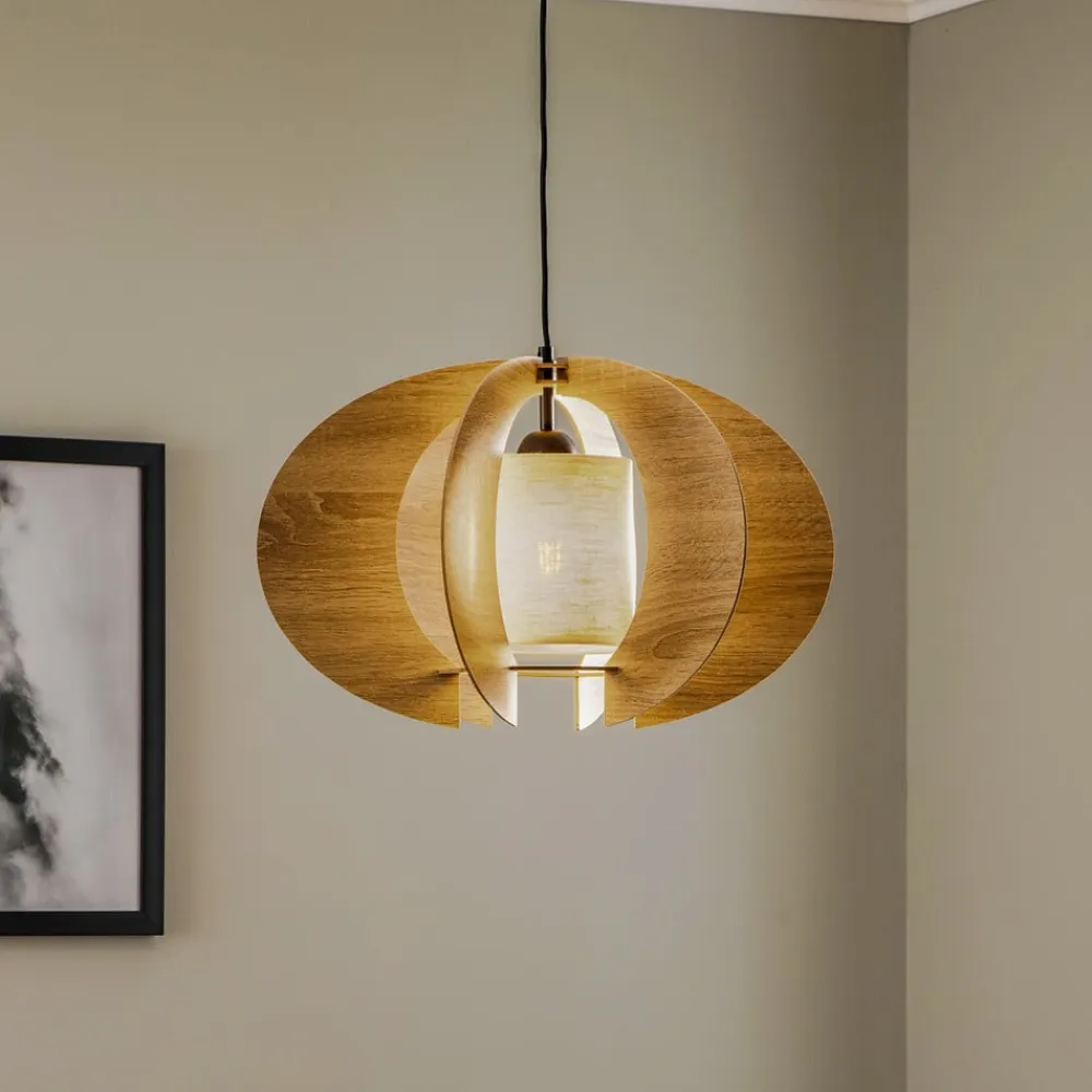 Hængelampen Modern C M forener moderne design med naturlige materialer og skaber dermed en harmonisk atmosfære i ethvert rum. Kombinationen af HDF, tekstil og pulverlakeret stål giver lampen en tidløs elegance, der kan integreres problemfrit i forskellige indretningsstilarter. Trælamellerne i farverne eg, ecru og sort sætter stilfulde accenter og skaber et varmt, indbydende lysspil.