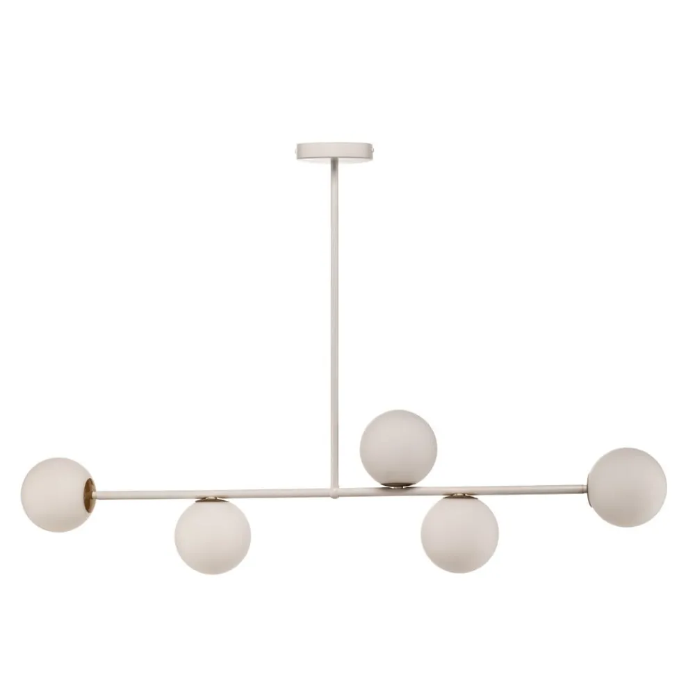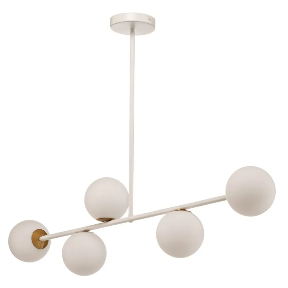 Hængelampen Gama 5 overbeviser med sin moderne stil og en imponerende kombination af pulverlakeret stål og glas. Denne lampe med 5 lyskilder i hvid og guld passer perfekt ind i forskellige boligområder som stuen, køkkenet eller spisestuen og skaber en harmonisk atmosfære. Den høje kvalitet og det europæiske design understreger eksklusiviteten af dette belysningsobjekt.