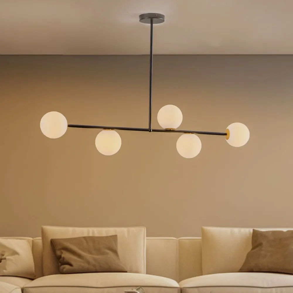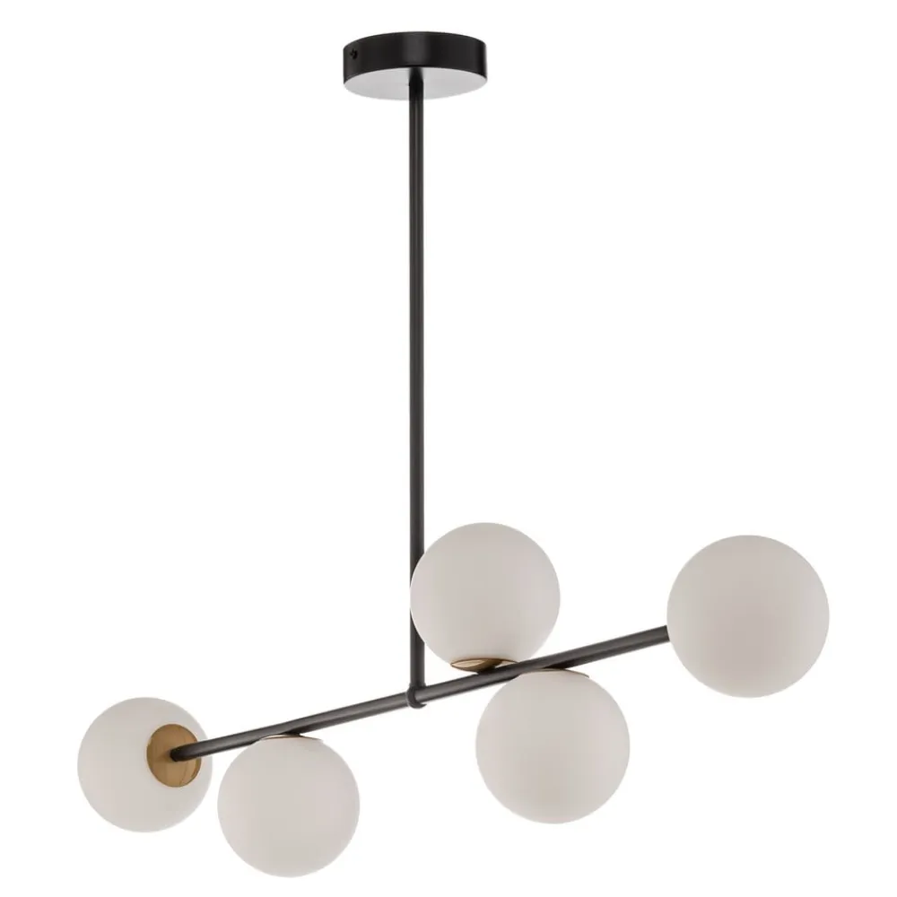 Hængelampen Gama 5 med 5 lyskilder har et moderne design, der imponerer med sin kombination af pulverlakeret stål og glas. Farven i sort, hvid og guld giver lampen en tidløs elegance, der passer perfekt ind i forskellige rumkoncepter. Uanset om det er i stuen, køkkenet eller spisestuen, sætter denne lampe stilfulde accenter og skaber en behagelig lysstemning.