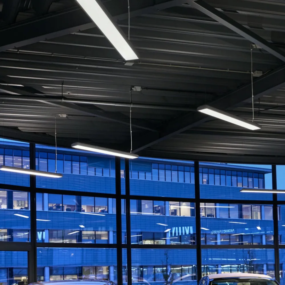 Dæmpbart Taris LED-pendelarmatur med EVG DALI Takket være den primære afblænding ved hjælp af en mikroafskærmning opnår Taris LED-pendelarmatur et blændfrit lys med et afblændingsindeks på UGR 19, hvilket gør det perfekt til brug i kontorer med computerarbejdspladser. Pendelarmaturet er fremstillet af plast, og den primære fotometriske afdækning består af en aksial linse af PMMA med en struktureret overflade. Det universelle hvide lys fra LED’erne udsendes symmetrisk både opad til indirekte, generel rumbelysning og nedad, hvor det f.eks. oplyser skrivebordet direkte. Det skaber en meget behagelig belysning på kontoret eller i mange andre områder med computerarbejdspladser. Udstyret med en dæmpbar EVG kan armaturet også dæmpes via DALI (medfølger ikke). Monteringssættet til ophængning af armaturet medfølger ikke – det skal bestilles separat – Tilslutning: terminal 5-polet – med struktureret aksiallinse og mikroafskærmning – symmetrisk bredstrålende med UGR 19 i synsretningen på langs og på tværs af armaturet – gennemsnitlig nominel levetid 50.000 h L80B50 ved UT = 25 °C