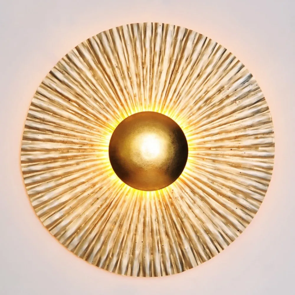 Med væglampen BRONZO skaber du et strålende værelse. Den sølvfarvede og runde jernskærm med indgraverede stråler, giver et fantastisk solskin når pæren, som gemmer sig bag ved den guldfarvede jernkugle i midten, tændes. Denne effekt gør væglampen BRONZO til en tiltrækkende lampe, som passer ind i mange forskellige indretninger. Kan også anvendes som loftlampe.