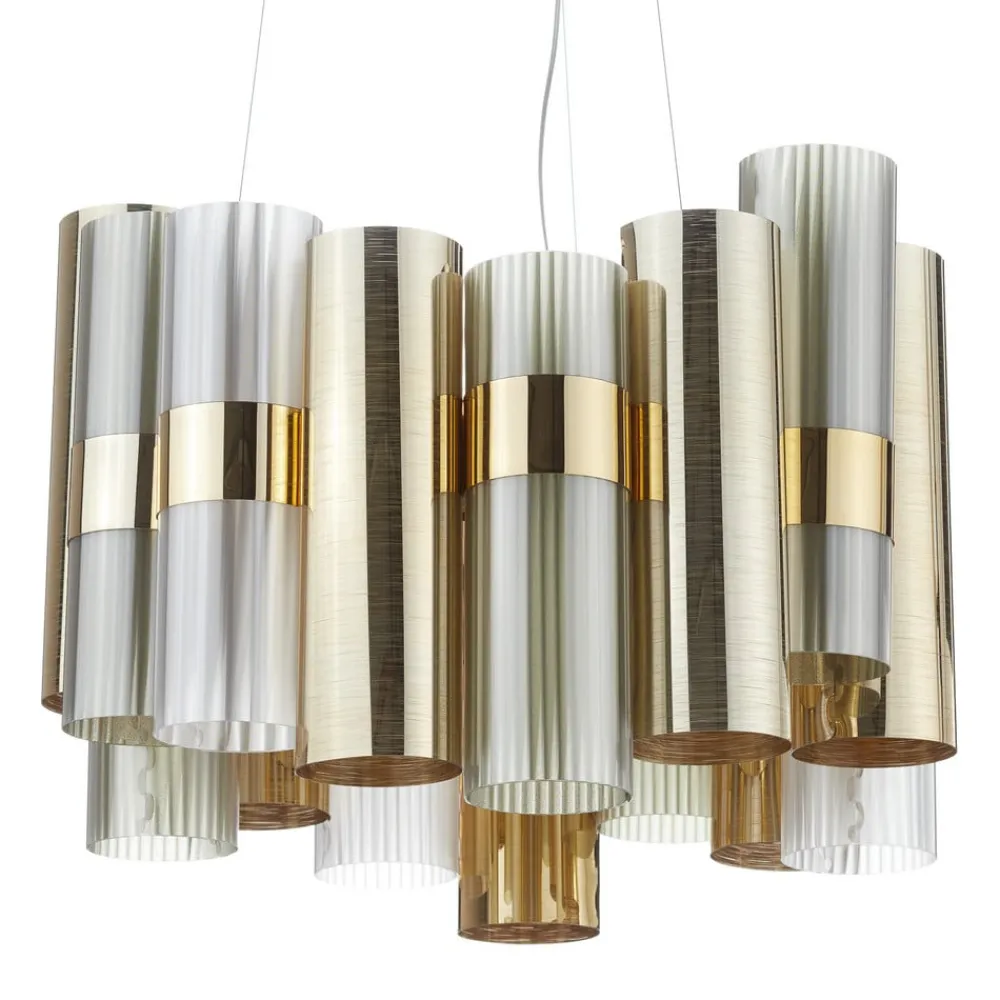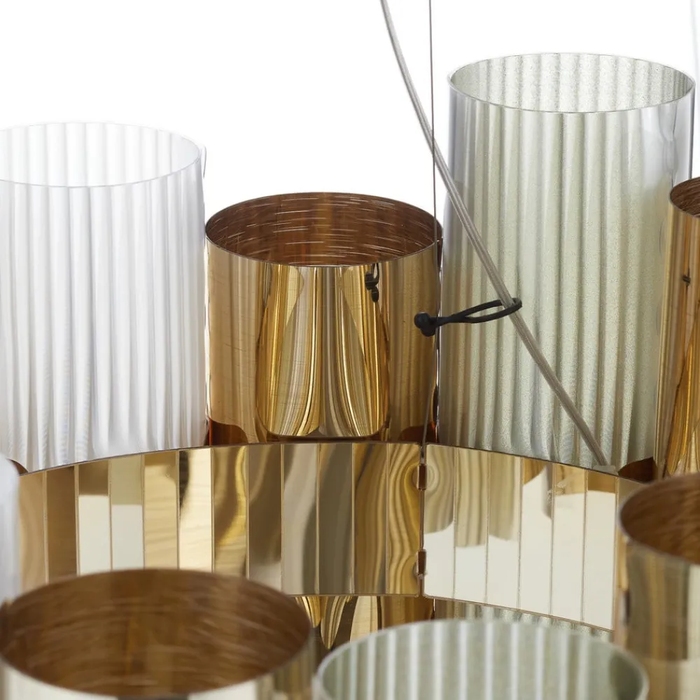 Cylindre i forskellige størrelser, farver og også lavet af forskellige materialer er trukket sammen omkring en ring i La Lollo-hængelampen. De forskellige egenskaber ved lampens individuelle elementer sikrer også interessante lyseffekter og sidst men ikke mindst en glamourøs atmosfære. La Lollo M i den gyldne version blev lavet af materialet Brushed Goldflex®, som blev specielt udviklet af Slamp .