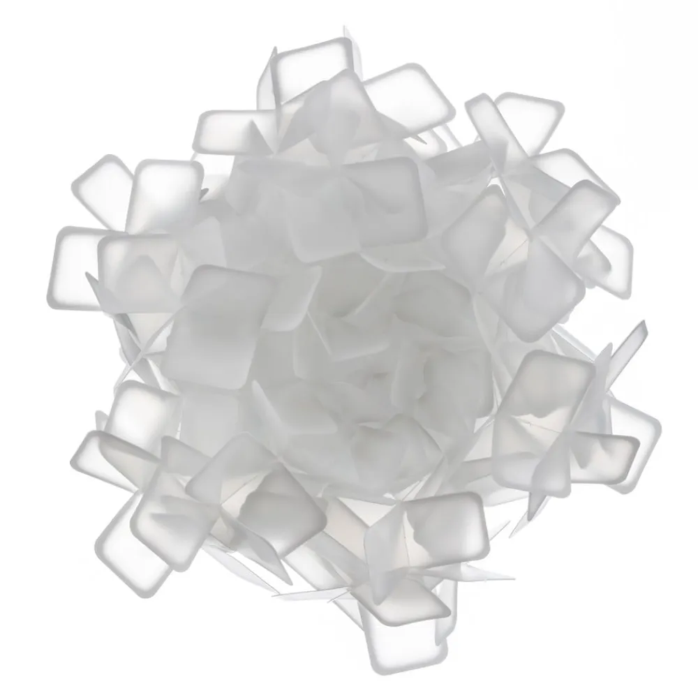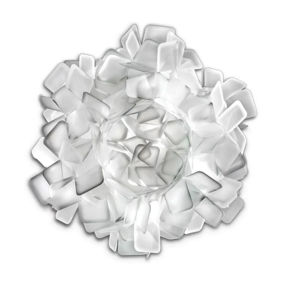 Mange små kvadrater er her sammensat af en enkelt større enhed og derved opstår der en helt ny form: I dette tilfælde er den kugleformede lampeskærm på væglampen Clizia. Opalflex®-materialet, som kvadraterne er skabt af, består af en kombination af førsteklasses kunststof og glaskrystal. Det kan genbruges samtidig med, at det har en fascinerende lysskraft, der kan sammenlignes med krystal. Med til Opalflex®-fordelene hører også, at det ikke går i stykker og, at det er meget fleksibelt at bearbejde. I væglampen Clizias tilfælde er kanterne på kvadratet af Opalflex® farvet ved brug af silketrykteknik. Når lampen tændes opstår der således et smukt lys- og farvespil.