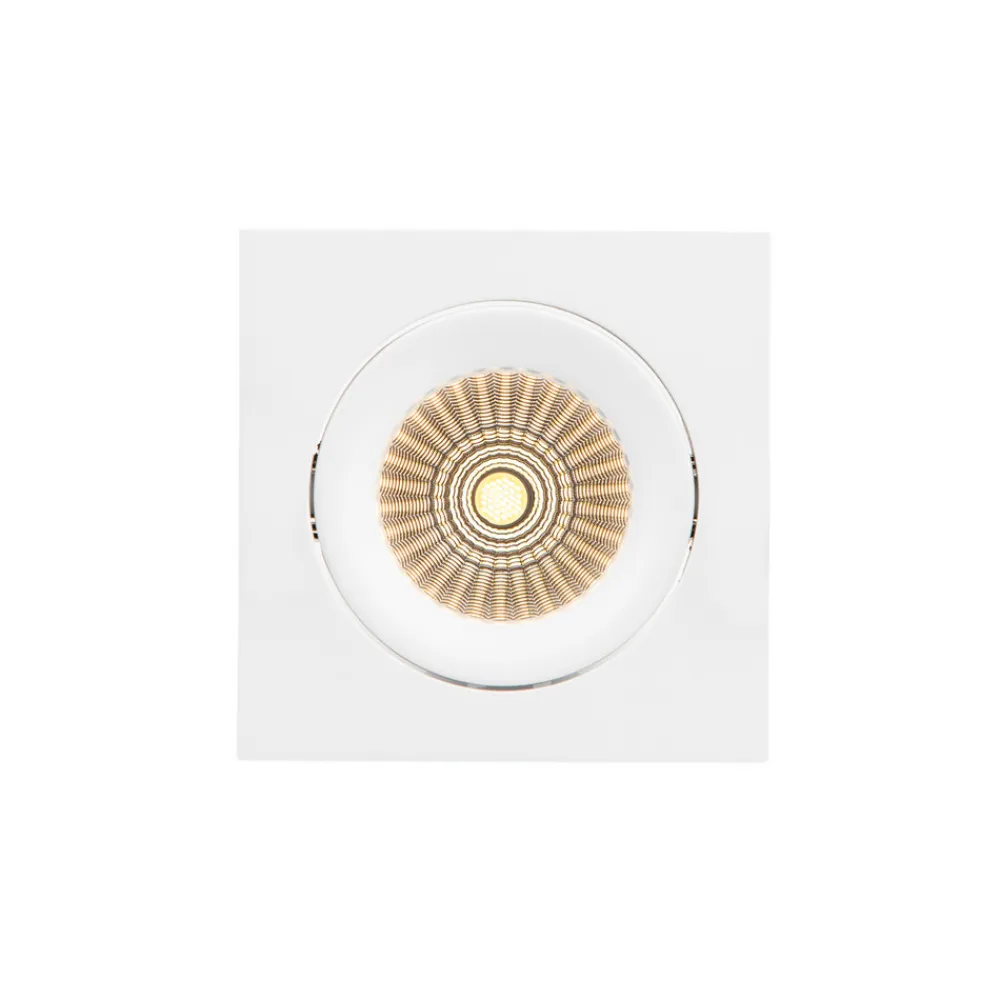 Indbygget LED-lampe DL04 Square X1 med drejelig lyskilde, dæmpbar, IP54 Den firkantede indbyggede LED-lampe DL04 Square X1 er udstyret med en LED-spot, der kan drejes hele vejen rundt (25°) og udsender varmt hvidt lys med god farvegengivelse (CRI > 90) og reduceret blænding (UGR < 22). Lyset udsendes i en medium bred vinkel (36°), hvilket gør den indbyggede downlight ideel til områdebelysning i kommercielle lokaler og kontorlokaler. Det indbyggede armatur er også det rigtige valg til udendørs områder takket være dets stænkvandsbeskyttelse. Den medfølgende driver er egnet til dæmpning via bagkantfasestyring.