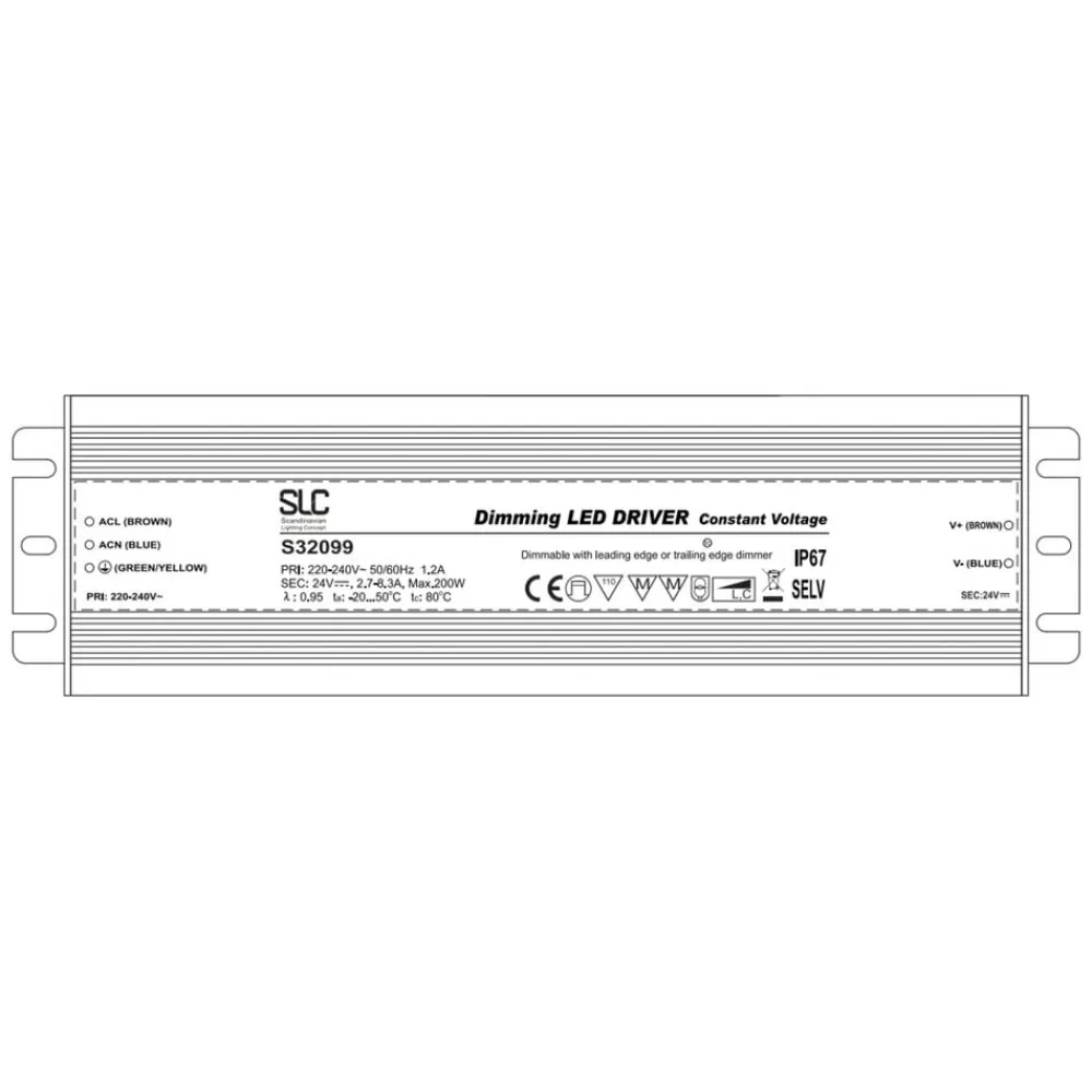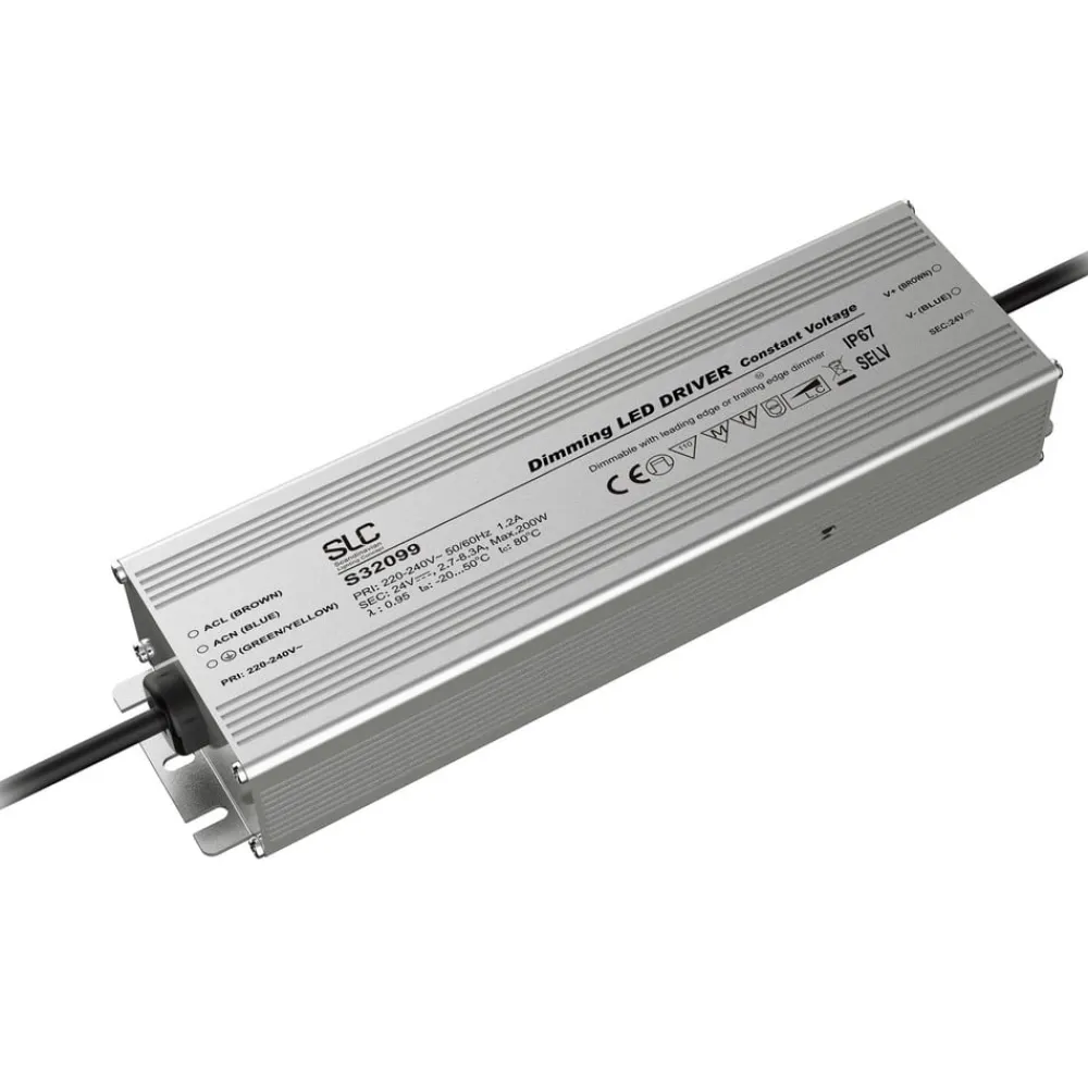 LED-driveren fra SLC er velegnet til LED-strips og andre produkter med 24 V driftsspænding og en samlet effekt på op til 200 W. Driveren har en indbygget PWM-dæmper og kan dæmpes eksternt via fasedelen. Kan også anvendes udendørs (beskyttelsesklasse IP67).