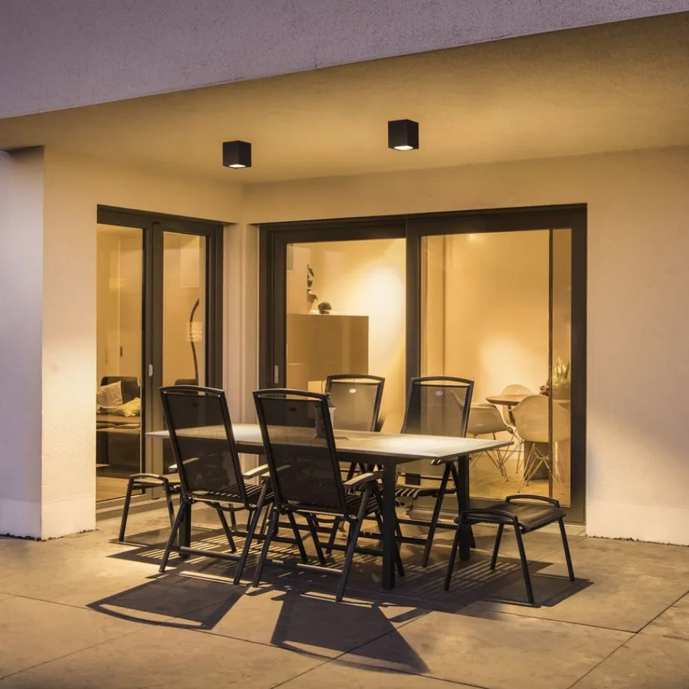 Alsidig LED-loftslampe Big Theo med kraftig LED-belysningsteknologi LED-udendørsloftslampen Big Theo oplyser erhvervsejendomme eller private hjem pålideligt og effektivt. Effektiv LED-belysningsteknologi er installeret i det kubeformede aluminiumshus, som både er vedligeholdelsesfrit og særligt effektivt og holdbart. Det varmhvide lys sendes nedad gennem husets åbning og giver god belysning af området. Monteret som et enkelt armatur eller i en gruppe kan det bruges til at belyse stier eller større områder på den bedst mulige måde.