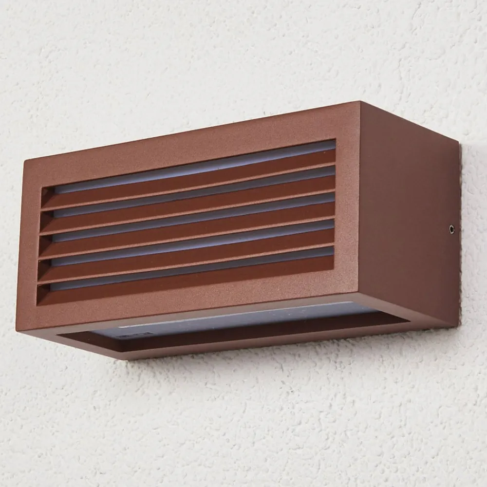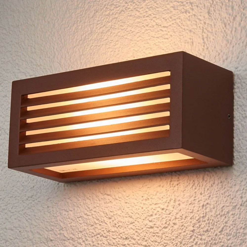 Rustbrun Box L udendørs væglampe – udsender spotlight på tre sider Alsidig, moderne og energibesparende – Box L-væglampen af aluminium i rustbrun passer til næsten enhver udendørs væg og udsender lys på tre sider. De påsatte lameller på forsiden giver ikke kun et flot udseende, de bløder også lyset op og sikrer blændfri belysning. Væglampen kan udstyres med pærer på op til maks. 18 W og op til en maksimal længde på 17,5 cm.