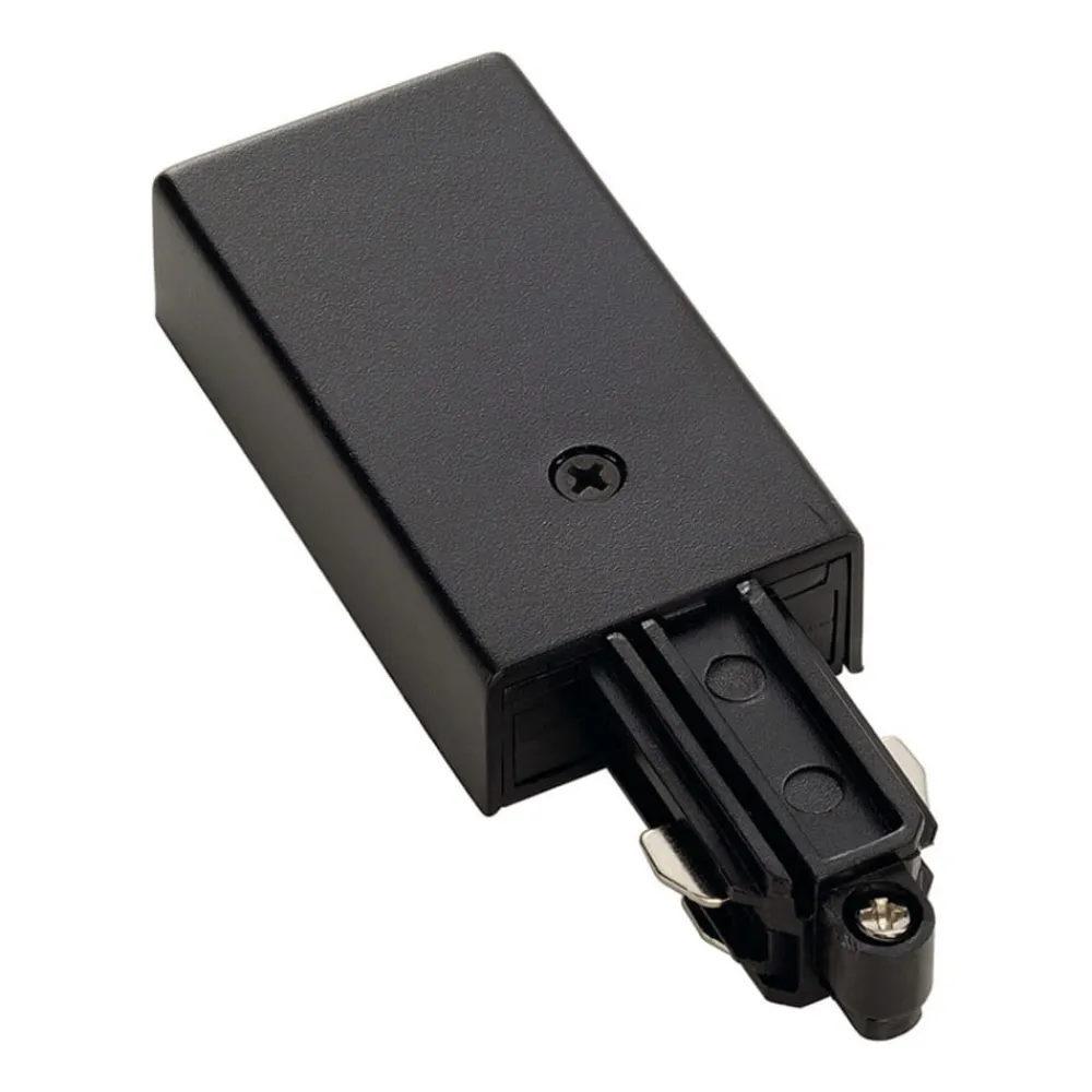 Indføring til højspændings 1-fase skinne, jord til venstre, sort Denne indføring med jordleder til venstre er velegnet til højspændings 1-fase skinnesystemet fra SLV. Den sorte version harmonerer visuelt i kombination med sorte skinner.