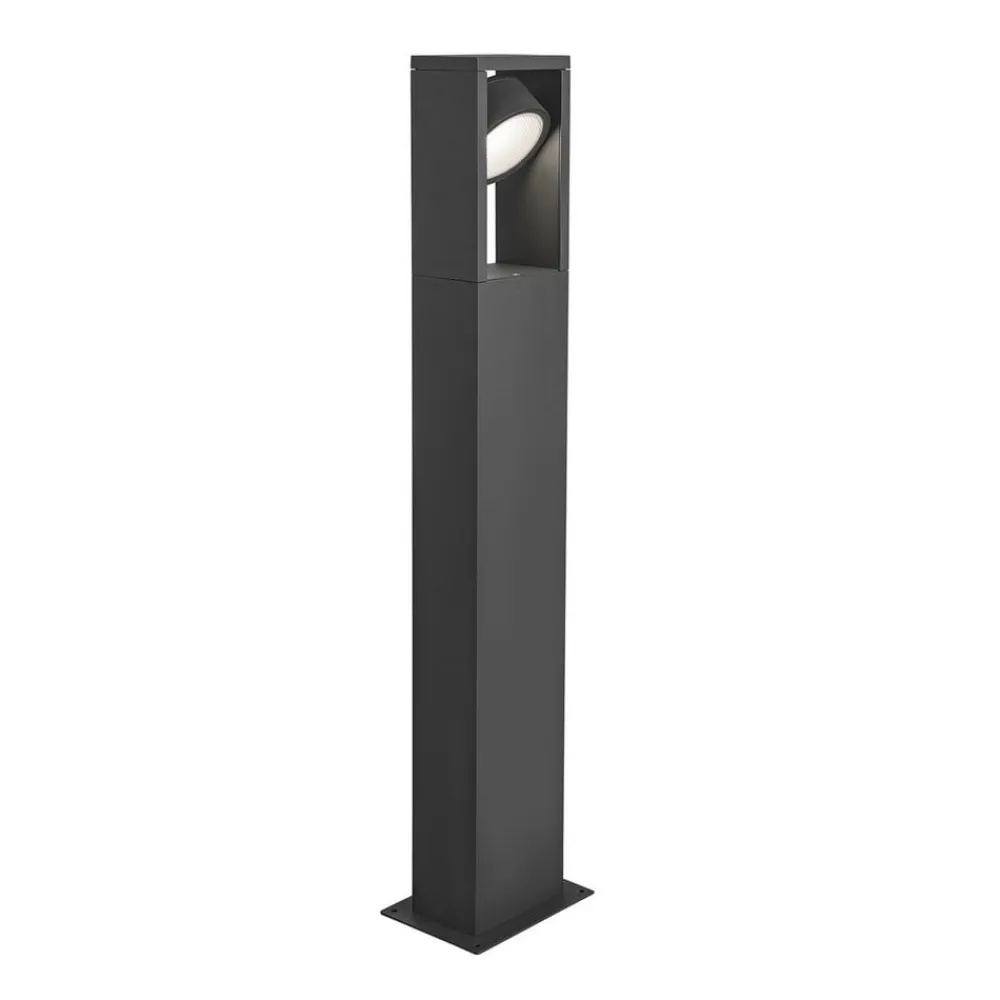 Med drejeligt hoved og CCT-funktion – moderne Eskina Frame LED-stibelysning Eskina Frame med sin antracit-sorte finish og kubiske form passer diskret ind i moderne udendørsområder. Den øverste del af stibelysningens aluminiumskrop er skåret ud og udstyret med et cylindrisk lyshoved med integrerede LED’er bag et satineret, fladt dæksel. Hovedet kan drejes, så lysudsendelsen kan vendes til begge sider af armaturet og belyse et område i forskellige afstande. Eskina Frame udsender enten varmhvidt eller universalhvidt lys; valget foretages via en lille skyder, der er placeret under et skruefast dæksel under hovedet – Lysudbytte ved 4.000 K: 1.200 lm – Omgivelsestemperatur under drift: – 20 °C til + 35 °C – Tilslutningsboks til kabeltilslutning fås som tilbehør