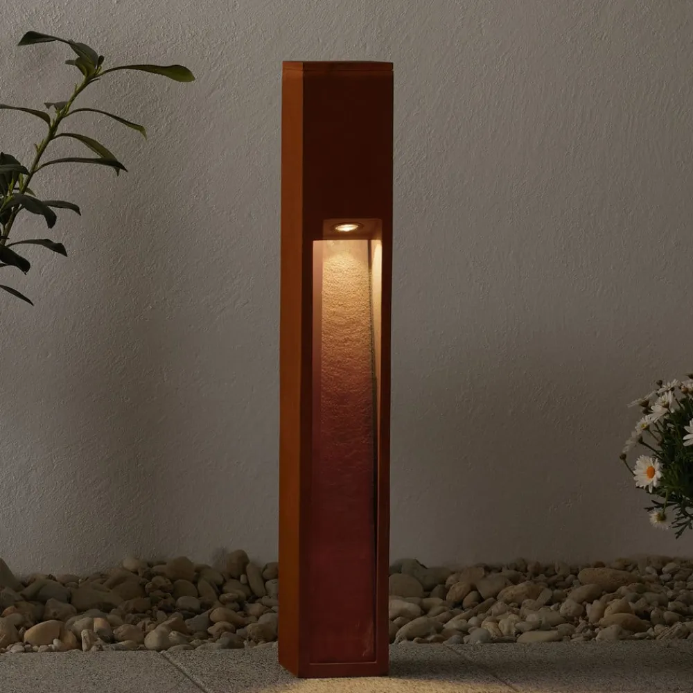 Rusty Slot 80 stibelysning – rustent design kan inspirere Som noget helt nyt i Rusty-familien sikrer Slot 80 med sit moderne og ligefremme design et rustikt og tiltalende design af udendørsområdet. På grund af produktionsprocessens individualitet er små variationer i overflade og form ikke bare mulige, men endda tilsigtede. Baggrunden for Rusty-armaturerne er, at stabilitet, energibesparende teknologi og en naturlig og kontrolleret overfladerustning skal kombineres med hinanden, samtidig med at der skabes et behageligt synsfelt med god belysning. Brugen af Cor-Ten-støbestål, som har en særlig høj modstandsdygtighed over for vejrlig, skaber et barrierelag af rust. Det beskytter kernen i materialet mod fugt, som igen beskytter mod yderligere rust. Samtidig forhindres afskalning af rustlaget på pålidelig vis.