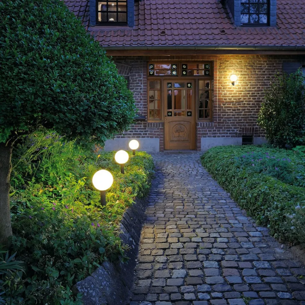 Æstetisk designet Gloo Pure-sokkelampe – højde 44 cm Gloo Pure er en sokkelampe, der ikke kun opfylder praktiske aspekter, såsom at fungere som et sikkert grænselys, men også fungerer som et dekorativt element på ejendommen. Den består af et aluminiumsrør med antracitfinish og en kugle af satineret glas, som kan monteres med en hvilken som helst lyskilde med E27-sokkel.