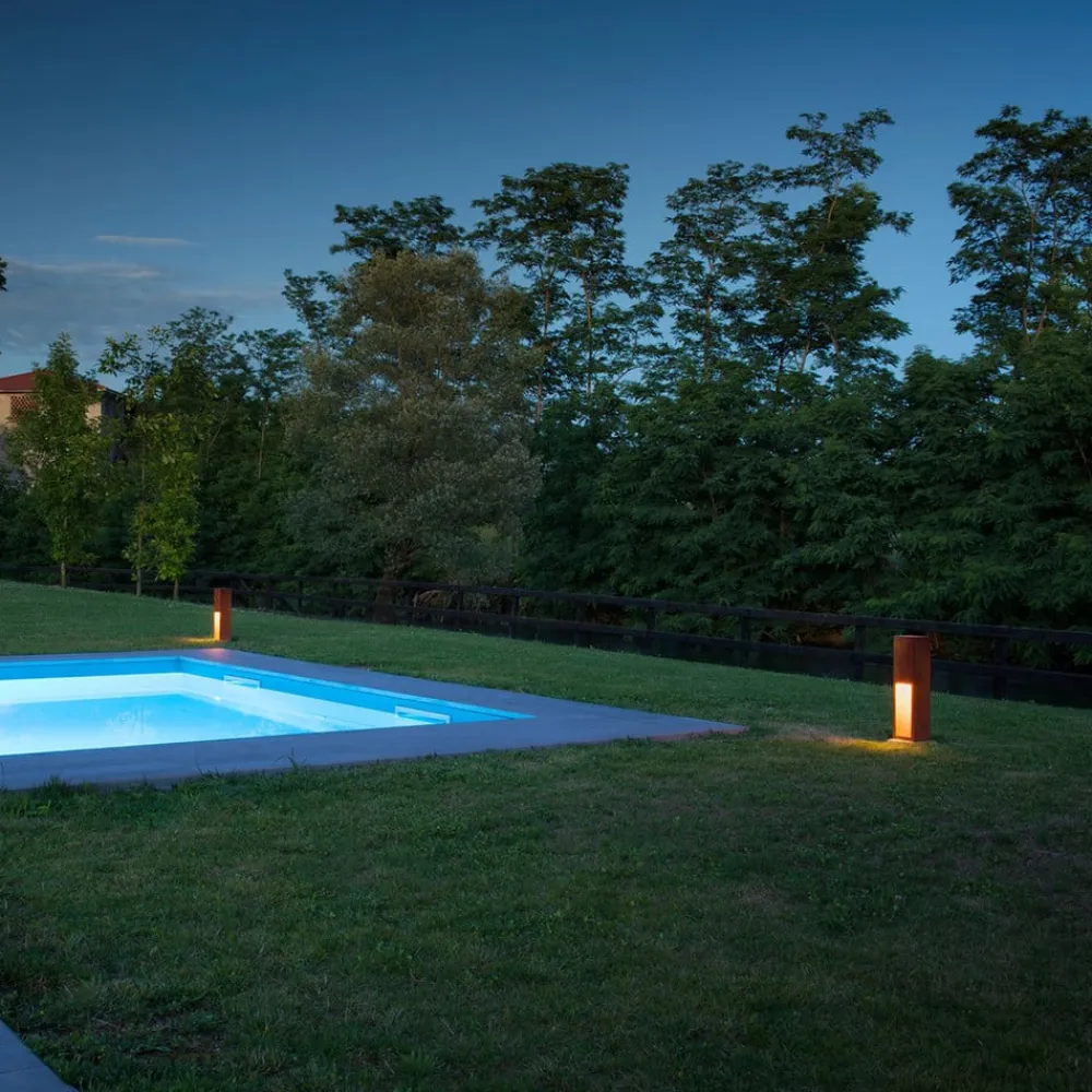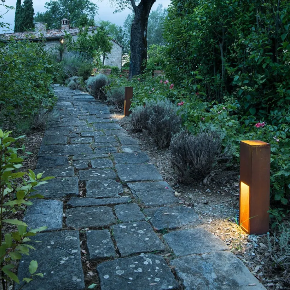 Rusty Slot LED-sokellampe med direkte lysudsendelse Rusty Slot LED-sokellampen i FeCSi-stål imponerer med sit usædvanlige rustne look. En særlig kemisk proces giver stålet sin smukke rustfarve. Der er ikke to armaturer, der er helt ens med hensyn til overfladeudseende – hver Rusty Slot er unik. En smuk måde at udstyre udendørsarealer på, ikke kun med omfattende perimeterbelysning, men også med dekorativ flair.