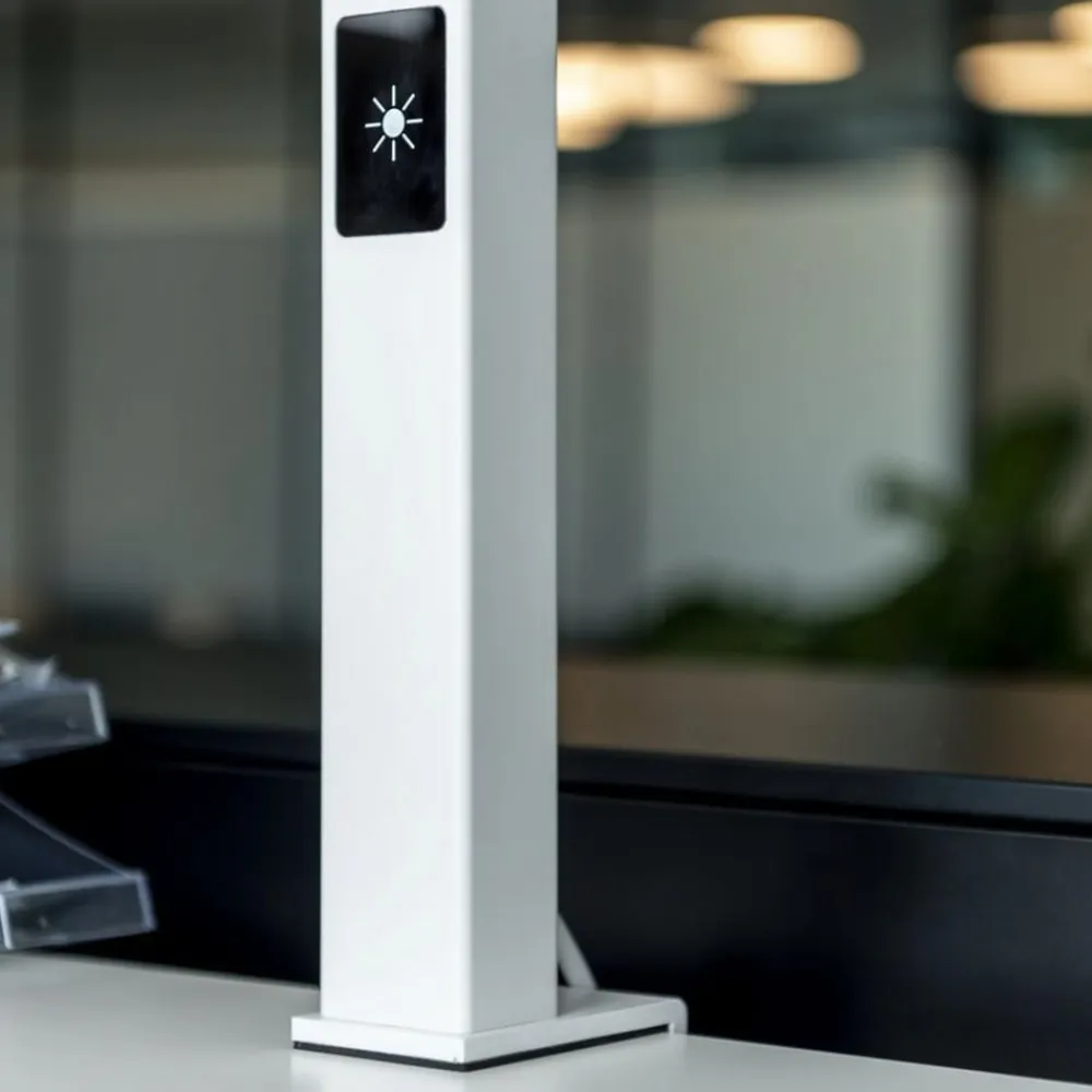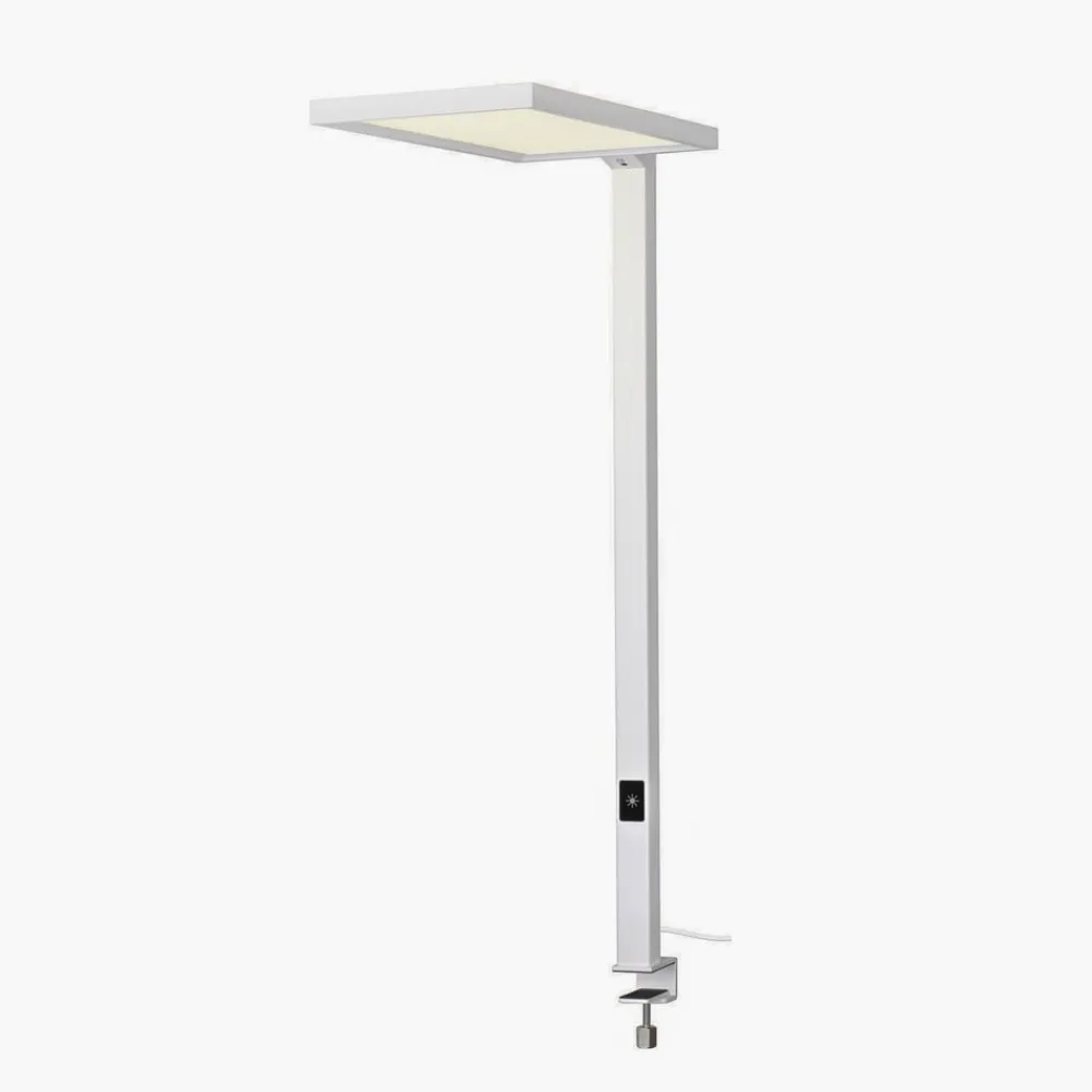 Allrounder på kontoret: Worklight LED-skrivebordslampe, der kan klemmes fast Worklight LED-klemmelampen kan placeres variabelt og pladsbesparende takket være klemmefastgørelsen til bordtykkelser på 0,6 til 4 cm. Aluminiumsrammen bærer et fladt, rektangulært hoved med integrerede LED’er. Deres universelle hvide lys udsendes over et stort område opad og nedad og giver omfattende omgivelses- og arbejdsbelysning. Den lave blændingseffekt gør den også velegnet til brug ved computerarbejdspladser på kontorer. Ud over betjening via touch-modulet på rammen er der også mulighed for automatisk styring. Til dette formål er Worklight udstyret med en bevægelses- og dagslyssensor, der skifter armaturet baseret på tilstedeværelsen af mennesker og regulerer lysudgangen baseret på den omgivende lysstyrke – God blændingskontrol: UGR < 19 – Bevægelsesdetektor: passiv infrarød – Slagfasthed: IK02