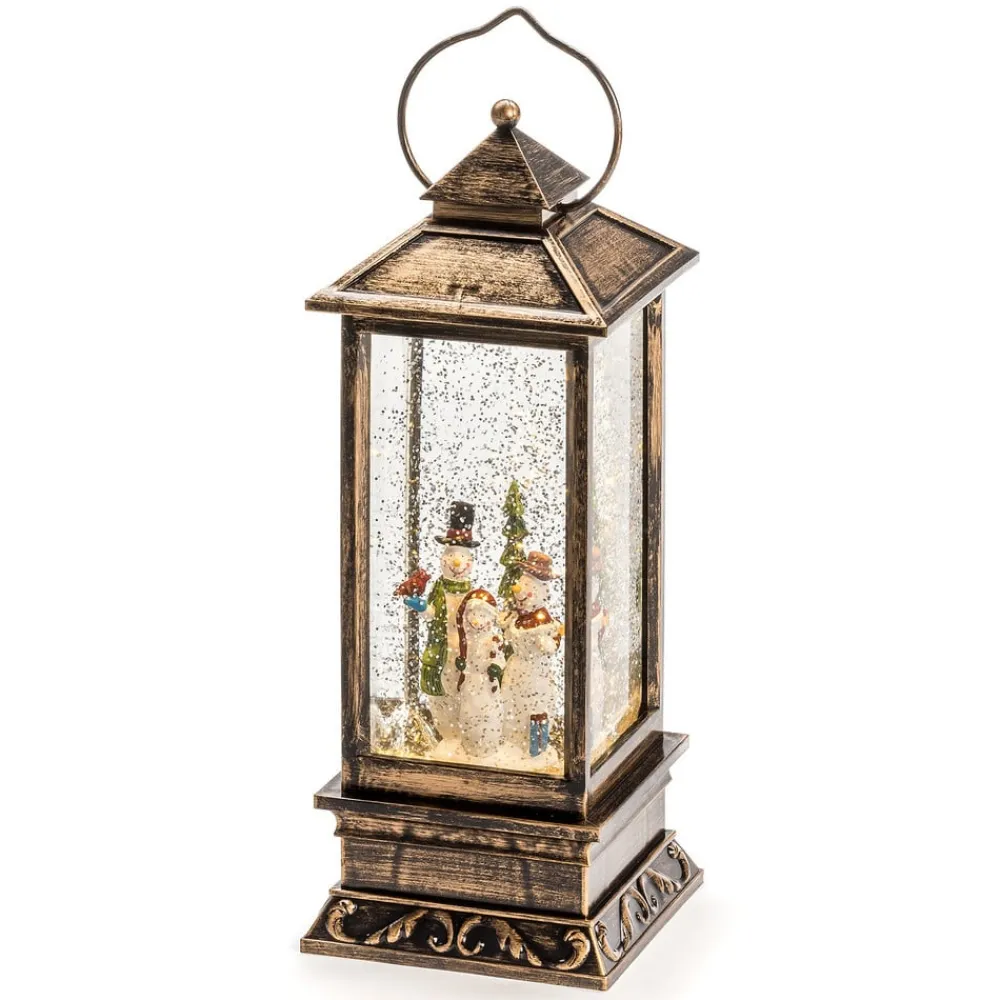 Denne flotte lanterne er designet ligesom de kendte og værdsatte snekugler: Den er fyldt med vand, hvori man ser et dekorativt vinterlandskab med snemænd og juletræ. Snefnug hvirvles omkring og oplyses af et varmhvidt skinnende LED-lys. Batterierne medfølger ikke ved leveringen (kan fås under tilbehør).