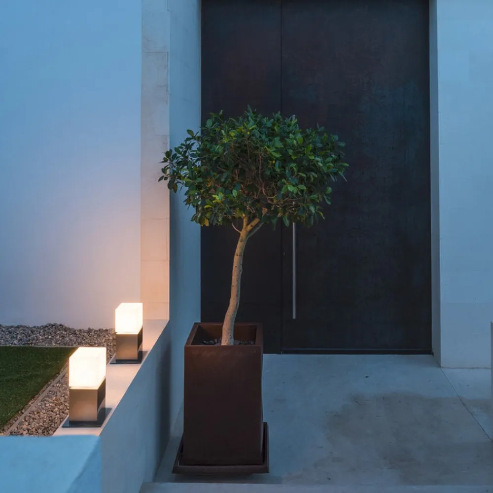 Sokkellampen Square Pole er fremstillet i rustfrit stål 304 og en opal akrylklods, der indeholder pæren. Kapslingsgrad IP44 gør den velegnet til udendørs brug. Med åben kabelende: Der kræves en forbindelsesboks. Et betonankersæt og en jordspyd kan fås som tilbehør.