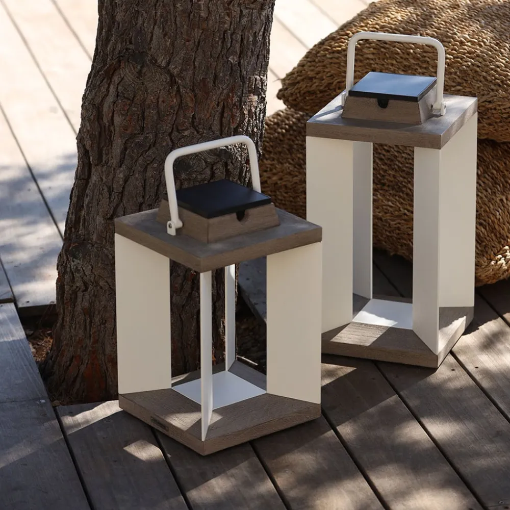 Moderne design LED-solcellelanterne Teckalu med bevægelsesdetektor Ud over sit moderne udseende har LED-solcellelanternen Teckalu mange funktioner, der gør den til et dekorativt og yderst funktionelt belysningstilbehør til ejendommen. Uanset om det er på terrassen, i forhaven, som lyskilde ved husets indgang eller foran campingvognen: Teckalu er både en energieffektiv og dekorativ lyskilde. Da der er installeret en bevægelsessensor, er lyset kun tændt, når der er brug for det. Teckalu kan lyse i op til 200 timer. Den kan genoplades enten via solcellemodulet eller via lysnettet ved hjælp af et USB-kabel. Fremstillet af ekstruderet, pulverlakeret aluminium og Duratek. Duratek: Teaktræet er ekstremt nemt at pleje. Det blev først børstet kraftigt for at opnå en struktureret finish. Efter et første lag vandtæt primer blev der påført fem lag grå finish. Denne proces beskytter træet mod vejret, UV-stråler og forskellige pletter som vin, kaffe eller olie. Den grå farve understreger det moderne, elegante look. Vedligeholdelse: Må ikke olieres. Rengøres med sæbevand – Kan dæmpes – Beskyttelsesklasse IP55 (støvtæt og beskyttet mod vandstråler)