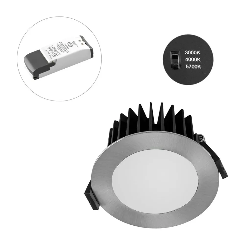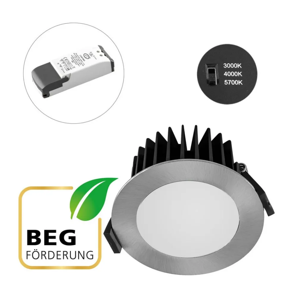 Rundt LED-indbygningsarmatur Solido85 med driver, 220-240V/AC, farvetemperatur justerbar, IP44Huset på LED-indbygningsarmaturet Solido85 er lavet af aluminium. Det indbyggede LED-modul er dækket af opalhvid plast, hvilket sikrer en blændfri og homogen belysning. En passende driver er allerede inkluderet i leveringsomfanget.På bagsiden kan farvetemperaturen indstilles via en kontakt før installationen. Her kan du vælge mellem varm hvid (3.000 K), universalhvid (4.000 K) og dagslys (5.700 K). Desuden kan intensiteten af Solido85 dæmpes eksternt via fasestyring.Tekniske egenskaber / karakteristika- driver inkluderet- farvetemperatur justerbar (3.000 K / 4.000 K / 5.700 K)- eksternt dæmpbar via fasestyring- lysfordeling: symmetrisk- bred fordeling: >80°- temperaturområde: -20 til 40 °C- gennemsnitlig levetid: 50.000 timer- spænding: 220 til 240 V / AC