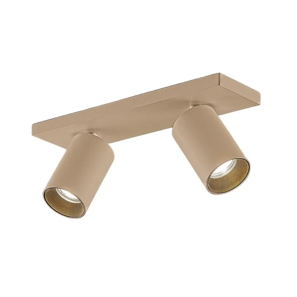 Brinja-lampen er holdt i farven Pantone® Iced Coffee og består af to cylinderformede spotlight, som begge kan vippes 90 grader og drejes 350 grader om sin egen akse. Spotlight er fastgjort til en rektangulær holder, så de kan monteres både på vægge og lofter.