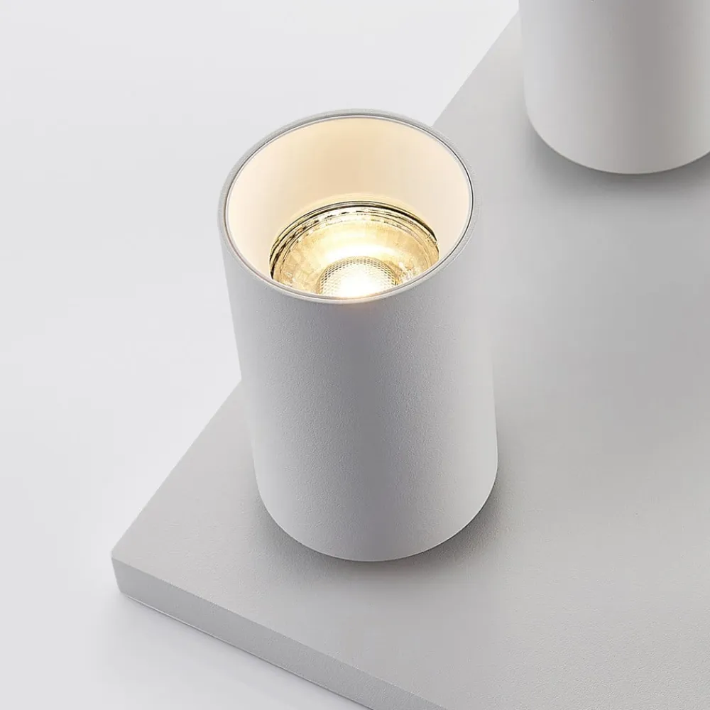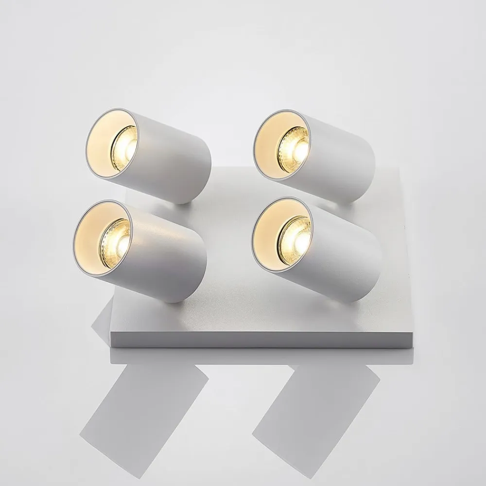 Lampen i aluminium passer perfekt ind i arbejds- eller opholdsrum takket være sit enkle udseende. De cylinderformede spotlight sidder på en firkantet holder, der holder dem fast og sikkert på plads.