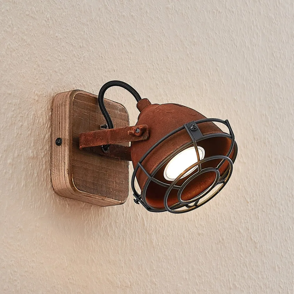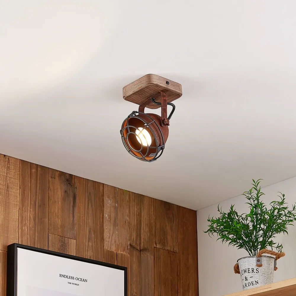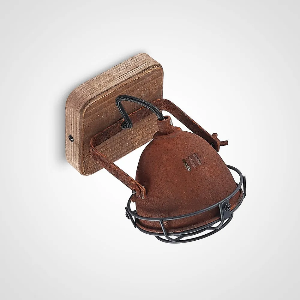 Farovi spotlight med rustfarvet skærm og træmontering Farovi spotlight med 1 lyskilde har et vintage-look takket være den rustfarvede skærm, der er formet som en gammel spotlight, og monteringspladen i træ, der har en meleret finish. Spotlightet har et sort metalgitter og er udstyret med en GU10-fatning indeni. Den kan drejes sammen med beslaget, hvor den er fastgjort til holderen, og kan også drejes i beslaget, hvilket gør spottet ideelt til at sætte lysaccenter i en lang række rum.