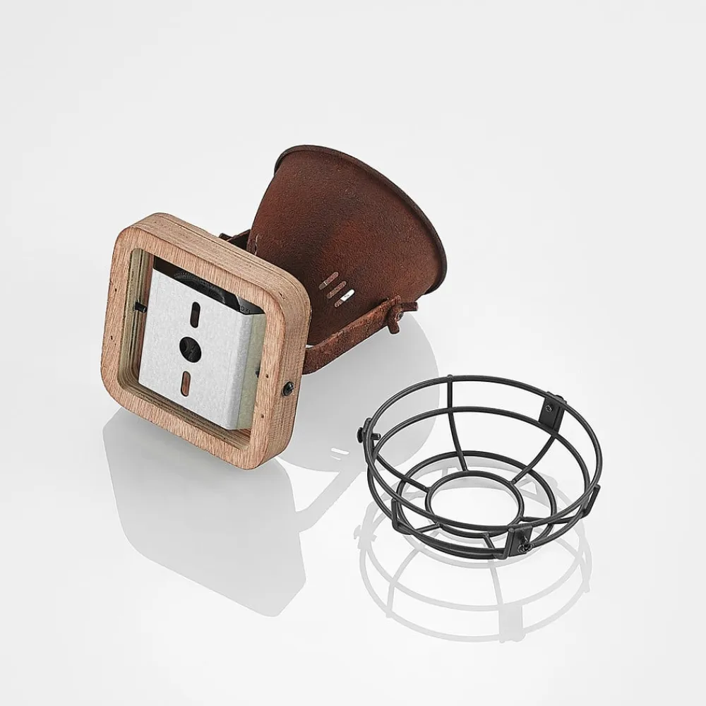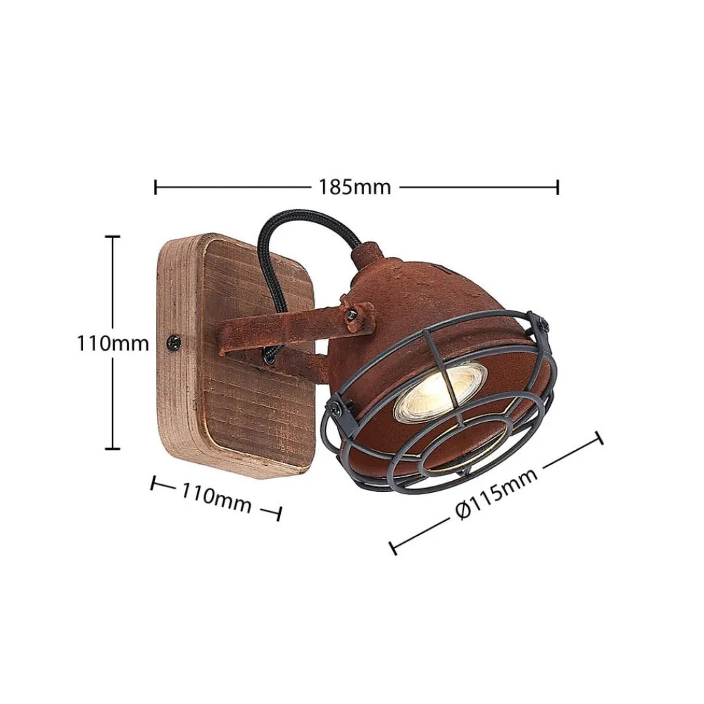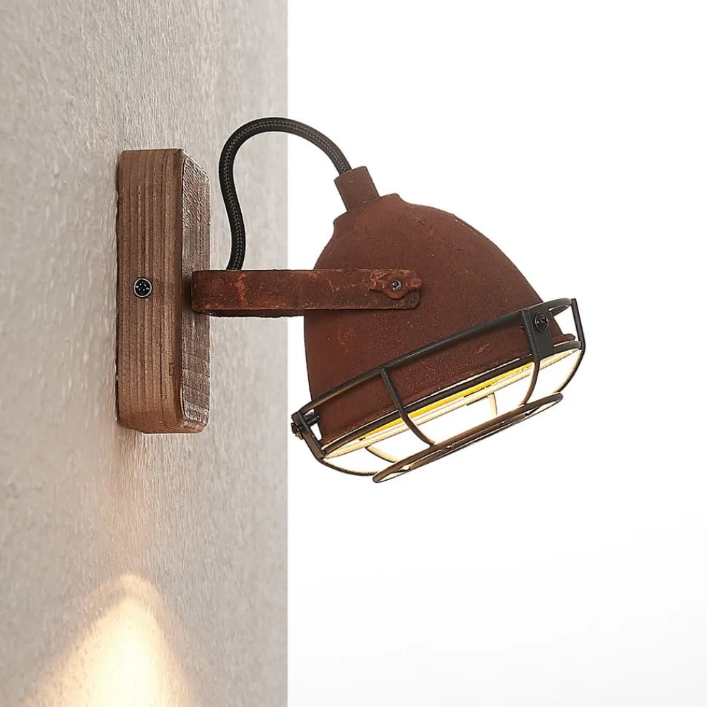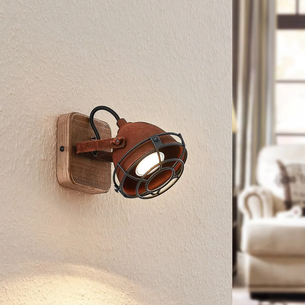 Farovi spotlight med rustfarvet skærm og træmontering Farovi spotlight med 1 lyskilde har et vintage-look takket være den rustfarvede skærm, der er formet som en gammel spotlight, og monteringspladen i træ, der har en meleret finish. Spotlightet har et sort metalgitter og er udstyret med en GU10-fatning indeni. Den kan drejes sammen med beslaget, hvor den er fastgjort til holderen, og kan også drejes i beslaget, hvilket gør spottet ideelt til at sætte lysaccenter i en lang række rum.
