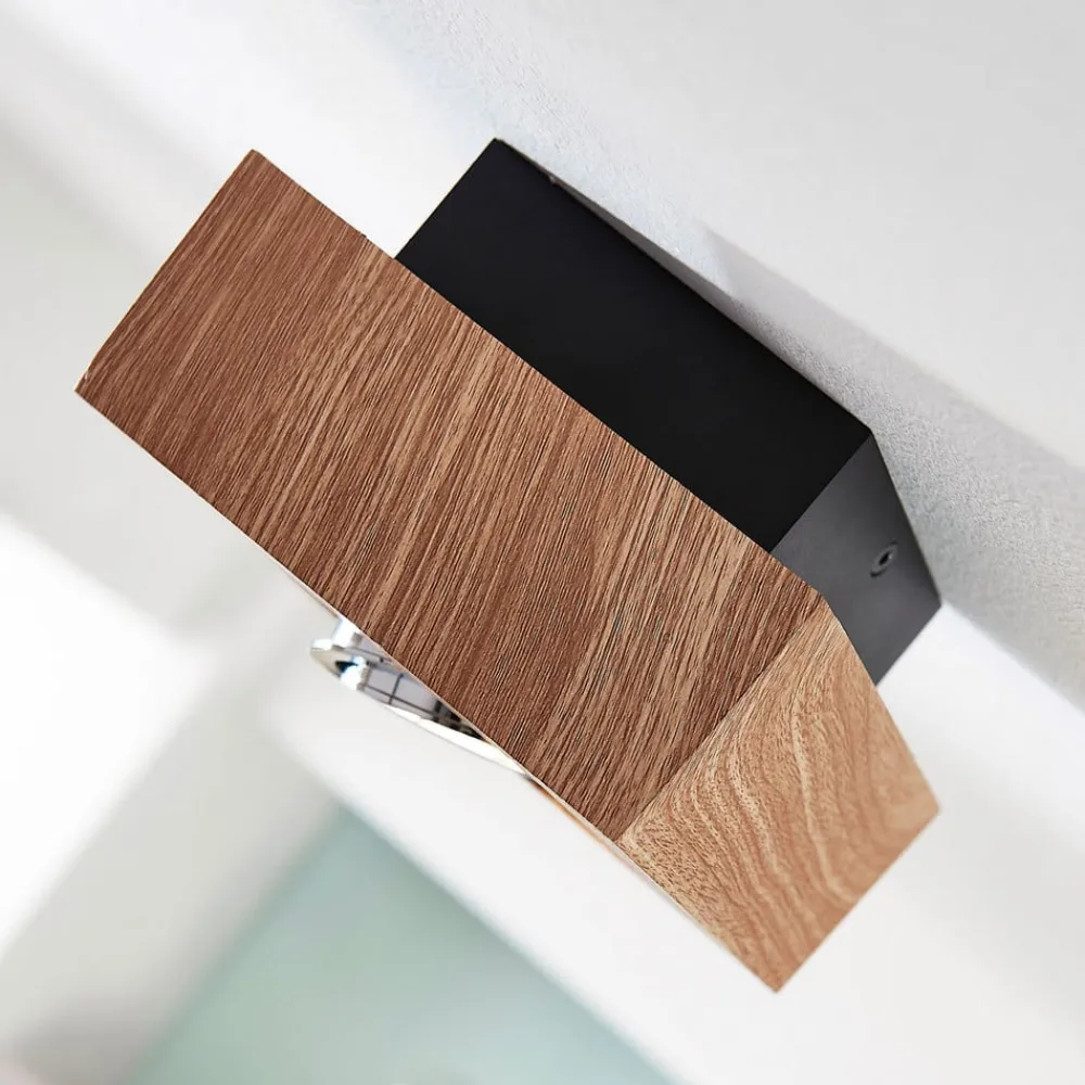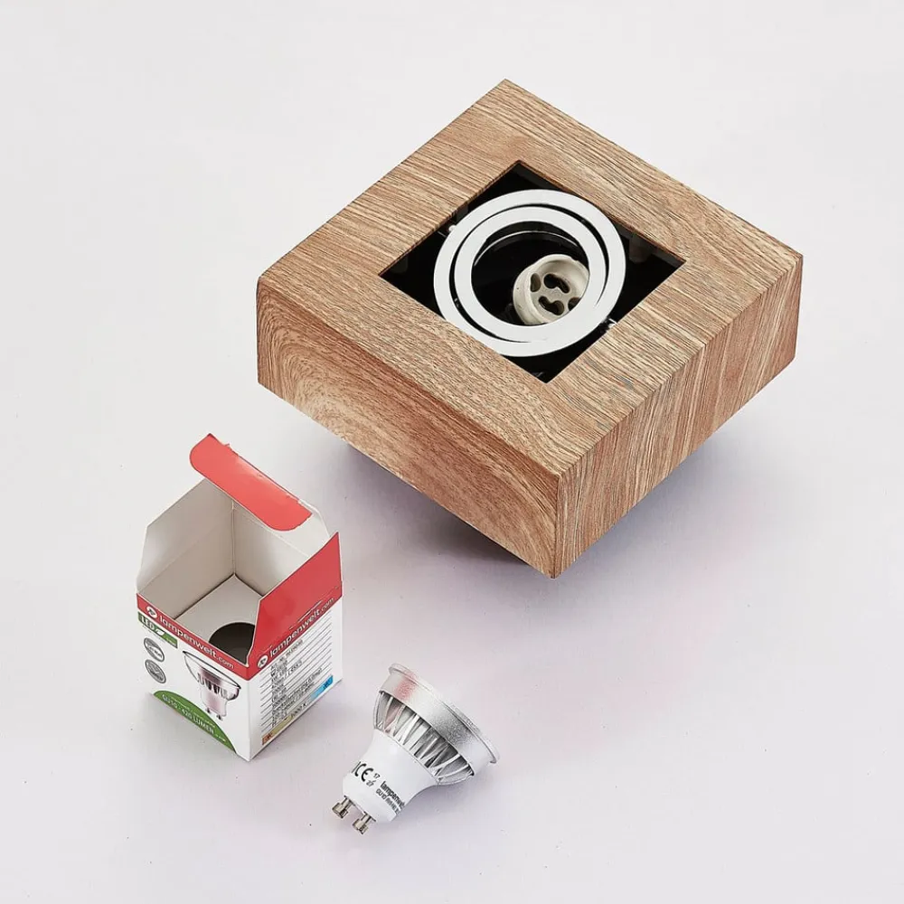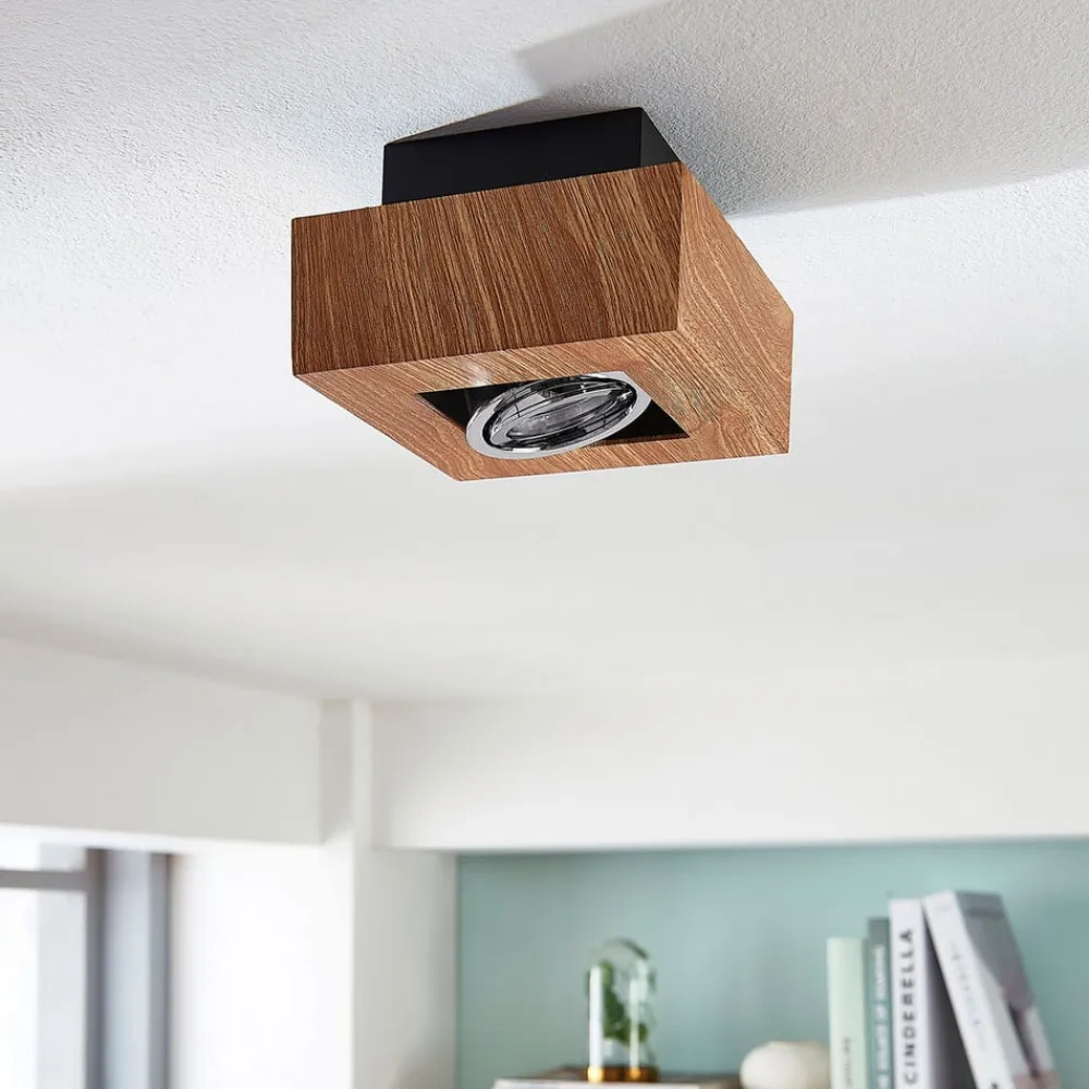 Vince loftlampe af metal med trædekor Denne loftlampe med GU10-fatning har et kompakt design og en firkantet grundform. Den indvendige lyskildeindsats kan drejes, så lysstrålens retning kan ændres. Trædekoren på metalrammen giver armaturet et naturligt look, mens en skrueløs klemme forenkler installationen af loftlampen.