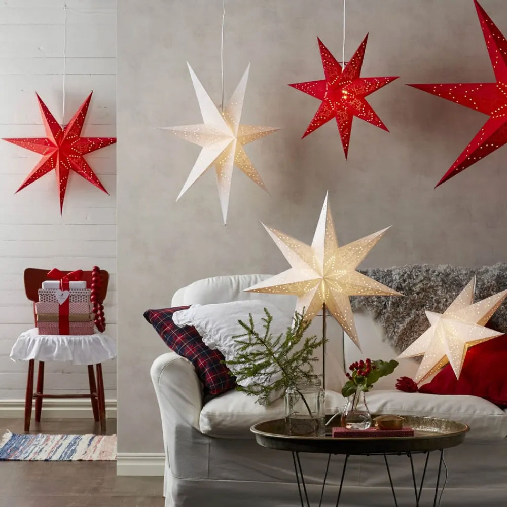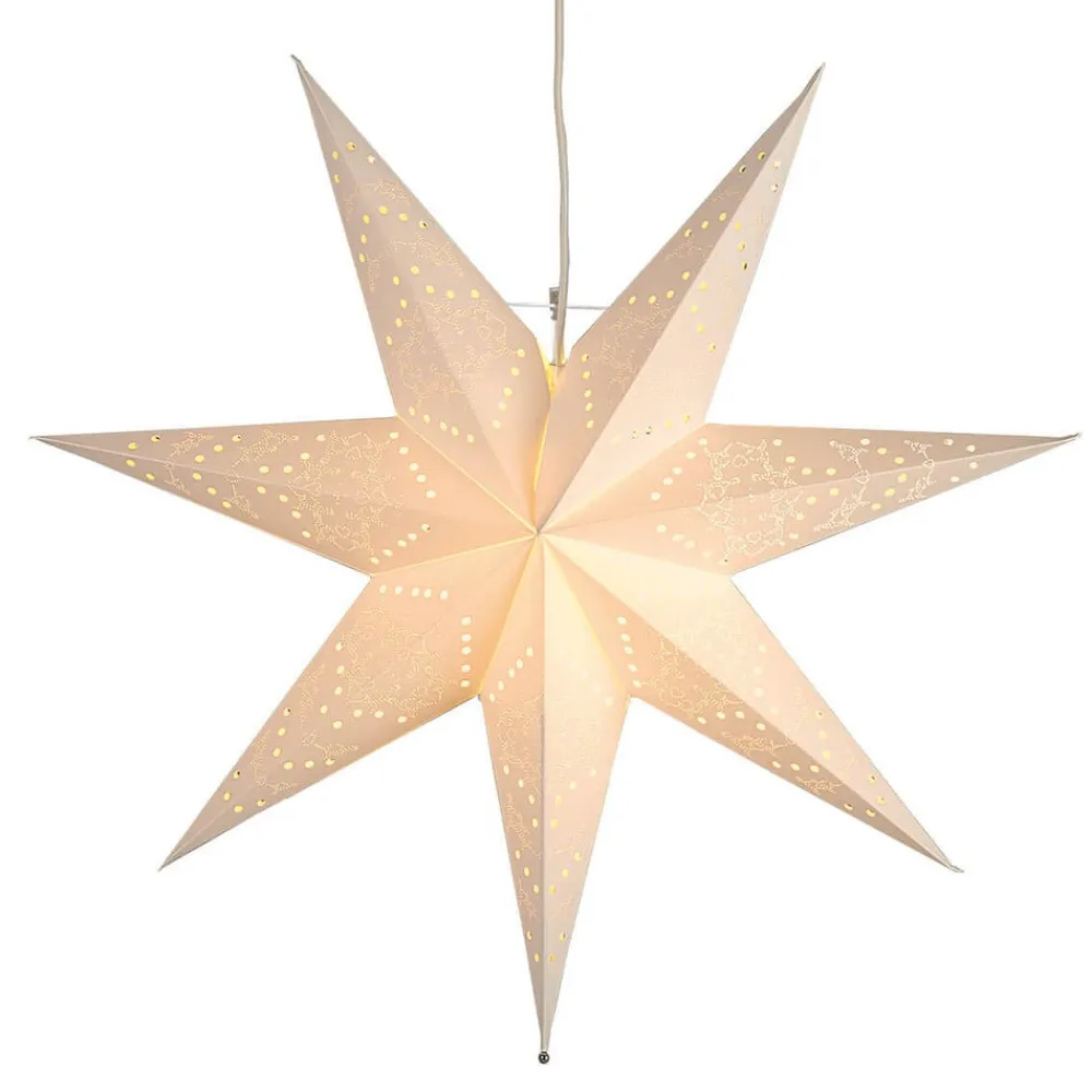 Denne vidunderlige syvtakkede stjerne med flot mønster har en diameter på 54 cm, og er både en fantastisk dekoration til vinduet, samt en stemningsfuld udsmykning i rummet under vinter- og juletiden. Der er allerede integreret en E14 fatning med ledning. Den passende pære kan bestilles under tilbehør. Den medfølger ikke i leveringen.