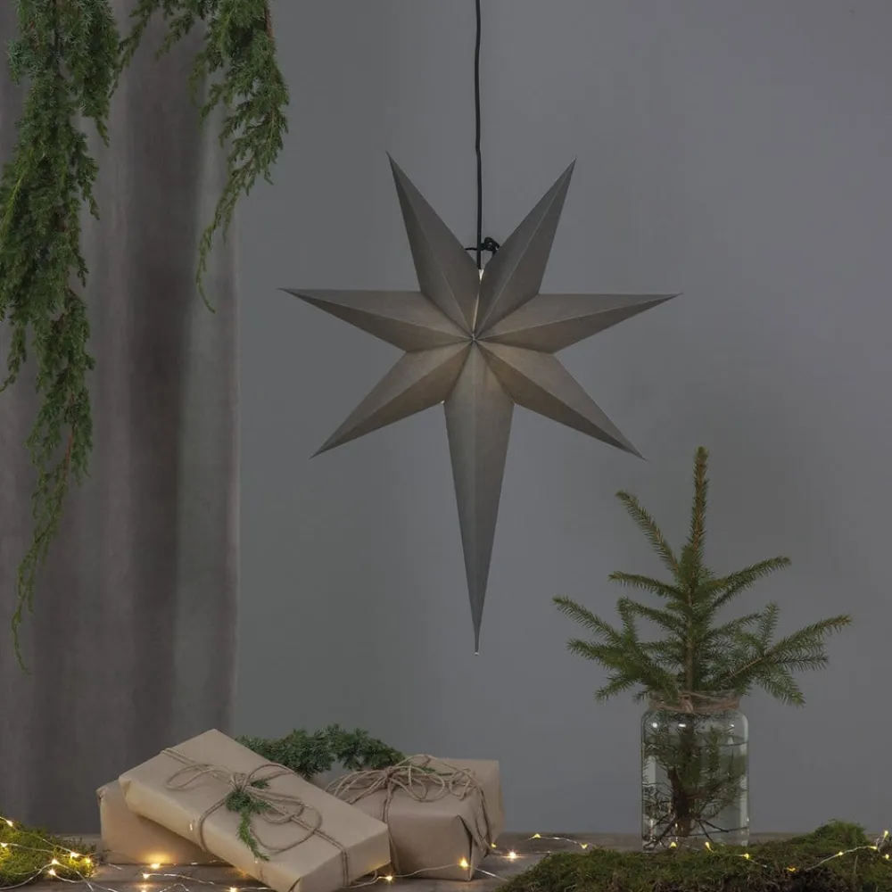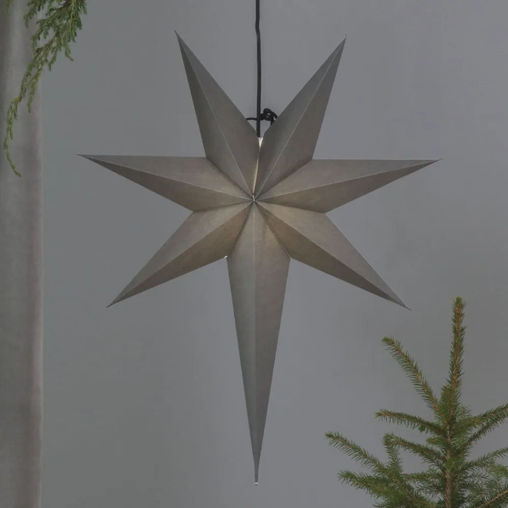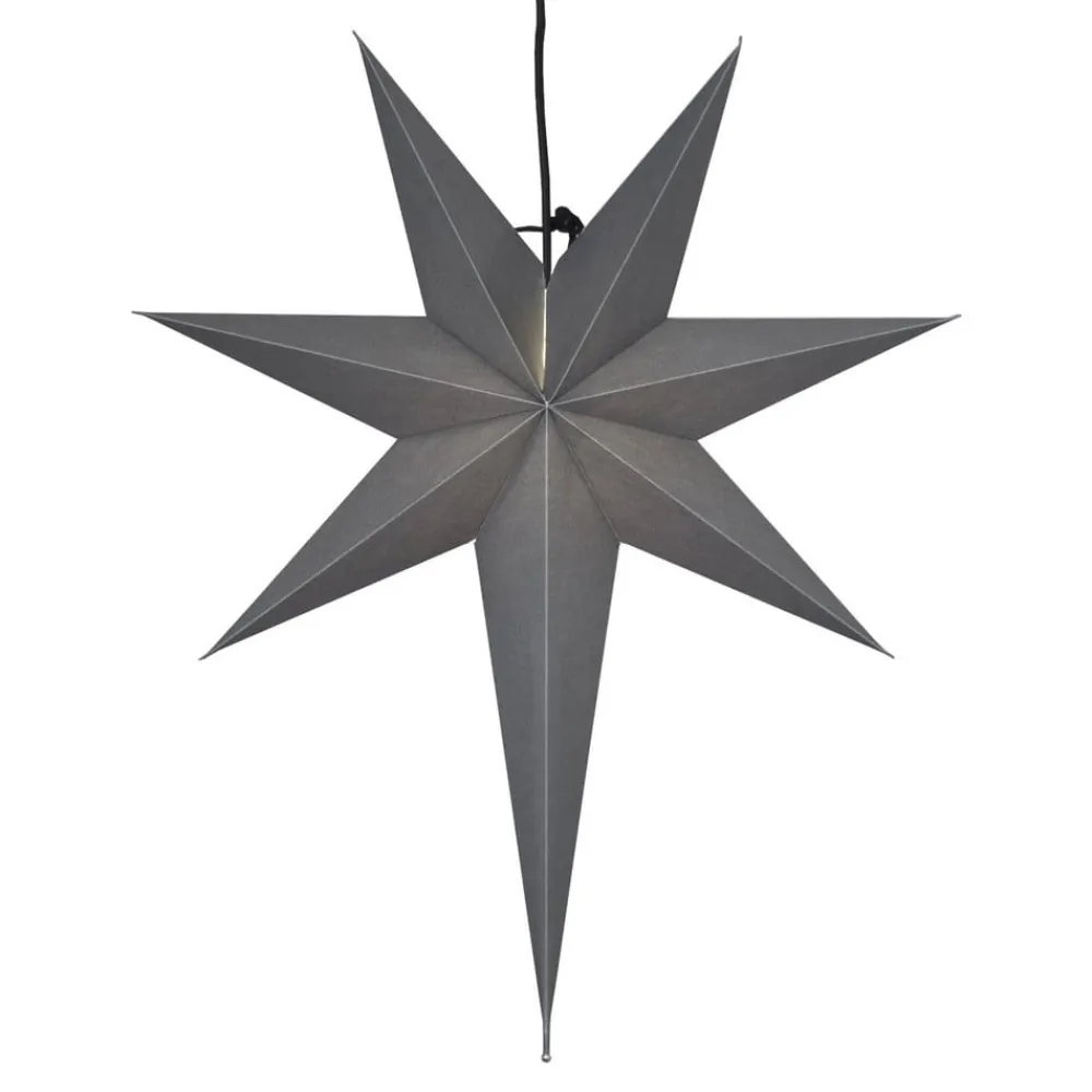 Markant formet papirstjerne Ozen i grå Den syvtakkede papirstjerne Ozen er særlig markant, fordi en af takkerne er meget længere end de andre. Den er særligt velegnet som vinduesdekoration i advents- og juletiden. Den er også et flot dekorativt tilbehør, når den hænger frit i rummet. En E14-fatning er integreret i stjernen. En pære er ikke inkluderet. Matchende lamper kan bestilles via tilbehøret – inkl. 350 cm tekstilkabel med stikprop