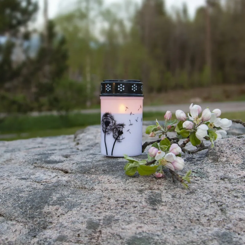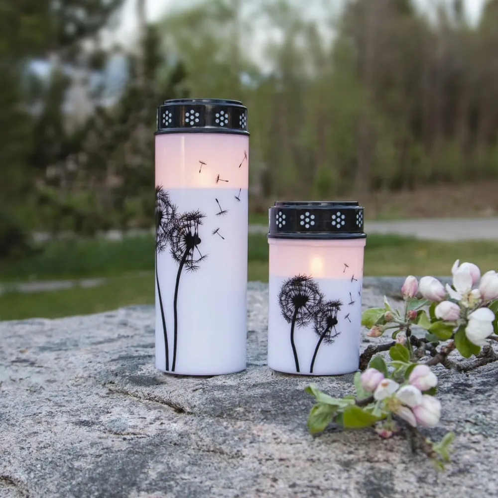 LED gravlys Dandelion med timerfunktion Dandelion er især beregnet til gravudsmykning. Det cylinderformede LED-gravlys er udformet som et klassisk gravlys med en hvid plastkrop og et sort låg. Motivet af sorte mælkebøtteblomster pryder ydersiden. Det stænktætte (IP44) LED-gravlys kan bruges permanent udendørs og er batteridrevet (2 x C, eksklusivt). Timerfunktionen (6 timer tændt, 18 timer slukket) muliggør automatisk skift.