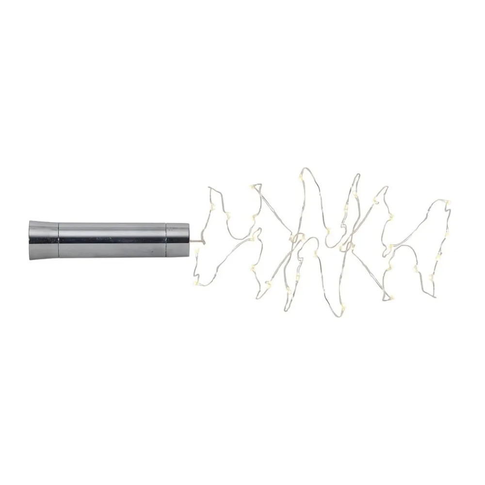 Med den 200 cm lange LED-lyskæde Dew Drops kan man oplyse et langt bord med en flot virkning, idet lyskæden er batteridrevet og batteriet (1 x AA – medfølger ikke) er gemt i et skønt, sølvfarvet rør. På det sølvfarvede trådnet er der placeret 40 varmhvide LED’er med en afstand på 5 cm, og ved batterirøret er der placeret en kontakt.