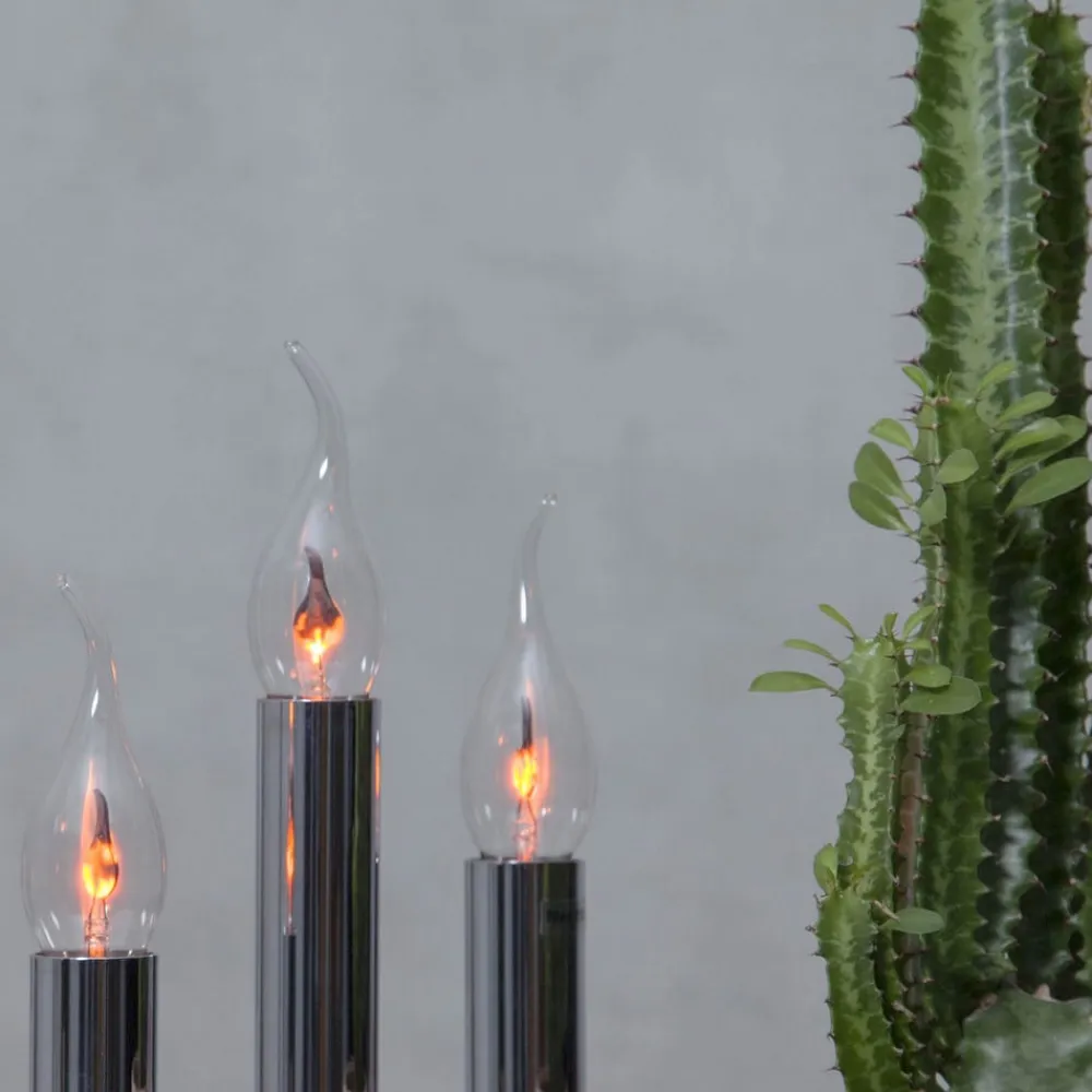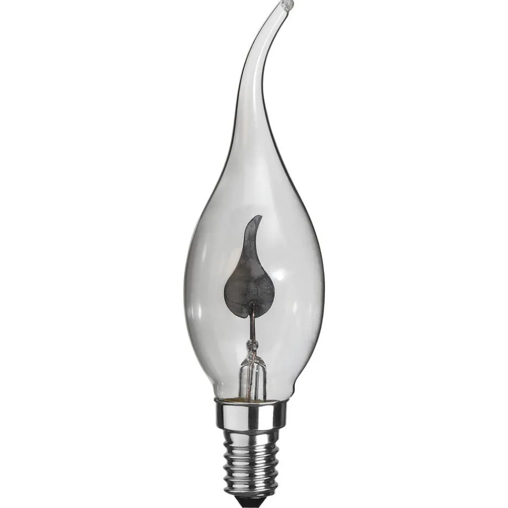 E14 3W LED-pære med flammeeffekt Denne lampe efterligner lyset fra et rigtigt stearinlys. Glasset er formet som en flamme i et vindpust og gør LED’en, som også er flammeformet, synlig. Lyset er særligt varmt og skaber en hyggelig atmosfære. De ujævne lyseffekter efterligner den flakkende flamme fra et rigtigt stearinlys. Takket være det elegante design og den effektive LED-lysliste er LED-lampen ideel til åbne armaturer og lysekroner. Egenskaber: kun beregnet til dekorativ belysning