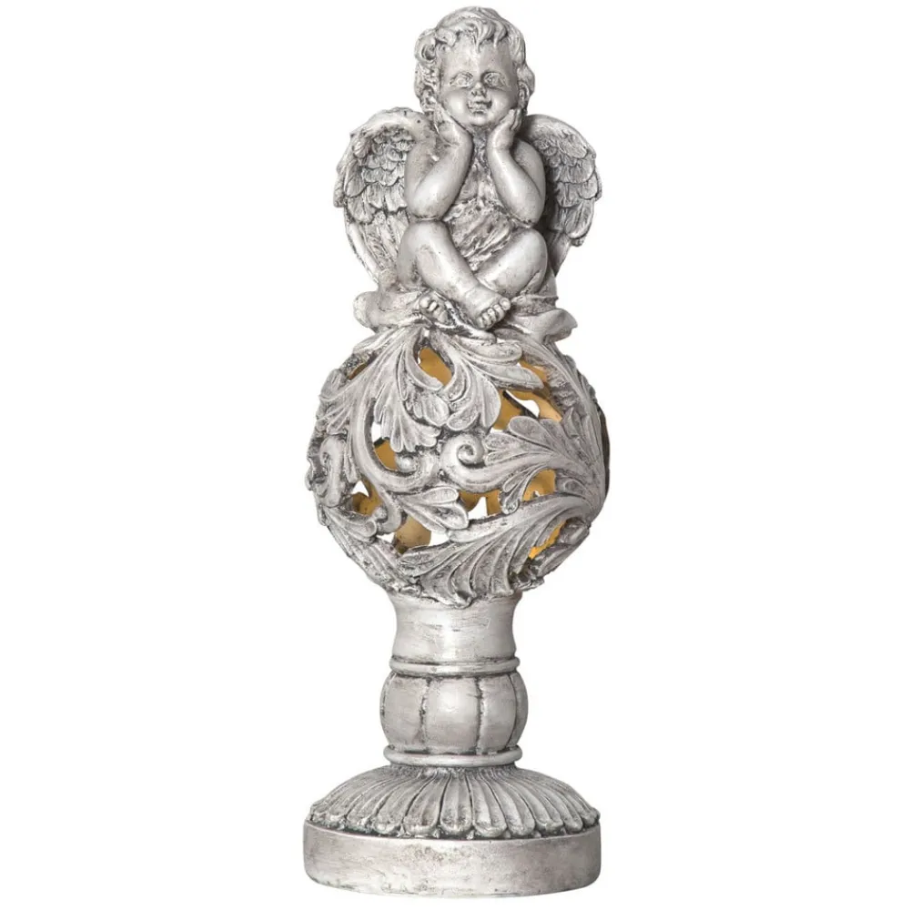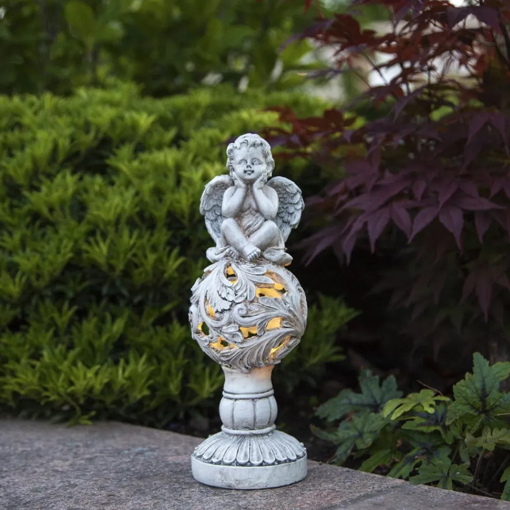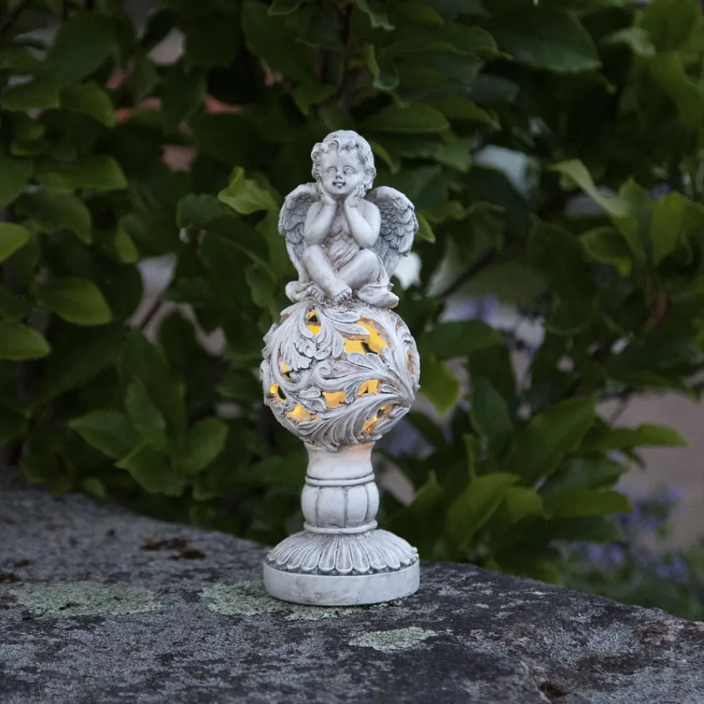 Den lille engel, der meget drømmende støtter sit hoved på begge sine arme, danner spidsen af LED-solcellelampen Angel. Den sidder på en kugle af blade, hvor der skinner lys fra LED’en indeni ud gennem åbningerne mellem bladene. Det hele står på en bred, rund sokkel, der minder om en antik søjle. Rent visuelt virker lampen, som var den hugget i lysegråt marmor. Teknisk set er den værdifuld med sin uafhængige kombination af genopladeligt batteri, der gemmer energien fra det indbyggede solcellemodul. LED’en styres med en skumringssensor, der tænder den, når der er mørkt.