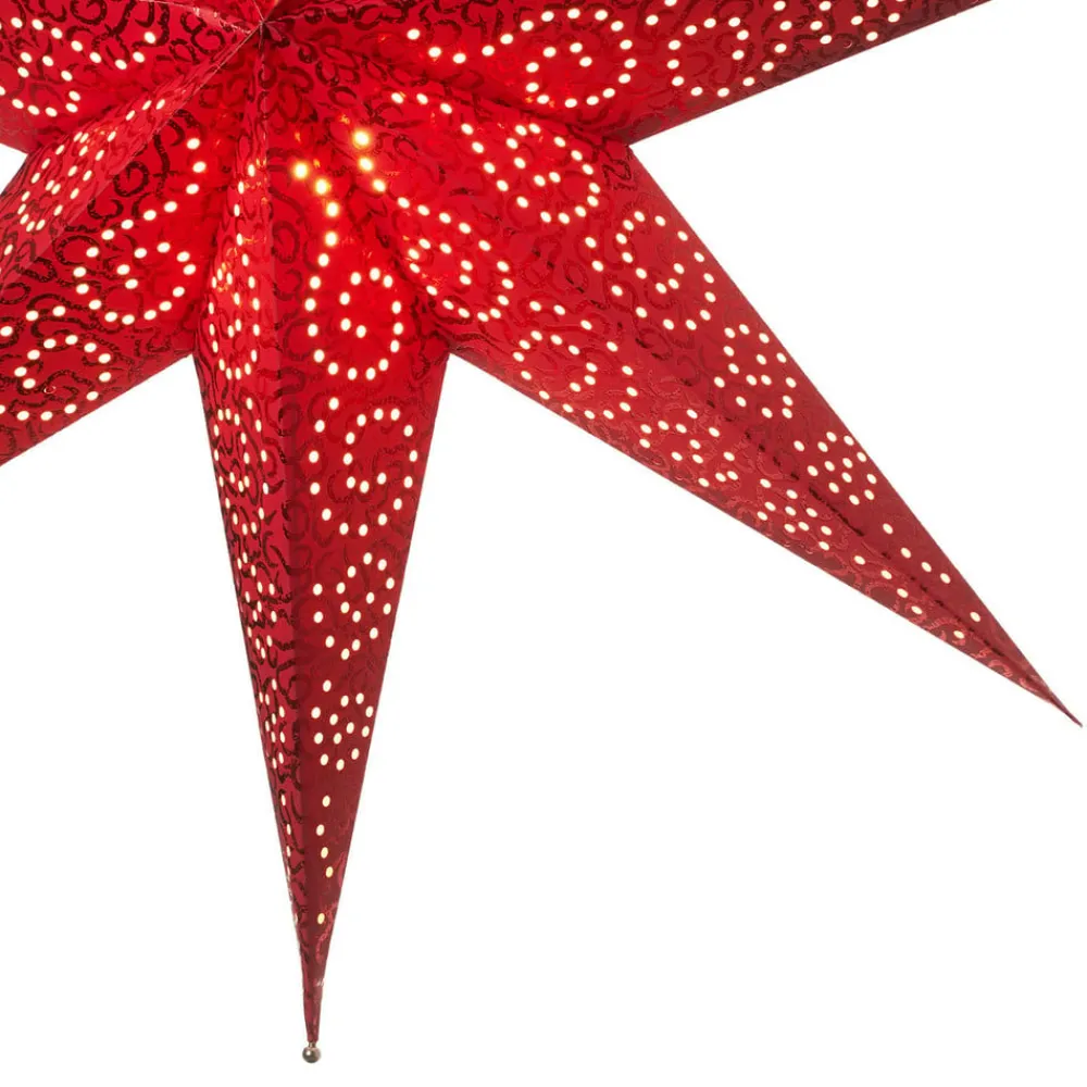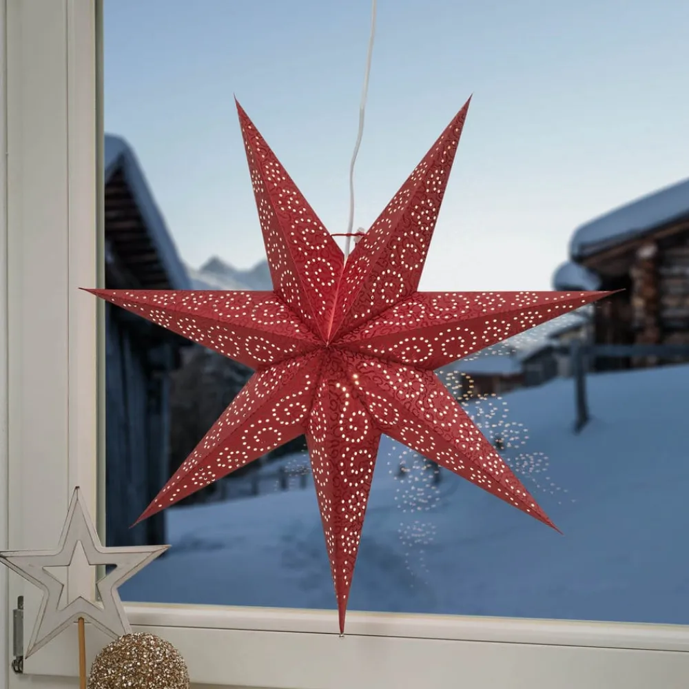 Denne stjerne med en diameter på 60 cm i rødt papir er dekoreret med et iøjnefaldende mønster af huller og leveres komplet med en 3,5 meter lang stikprop. Den antikke papirstjerne er ikke kun attraktiv i juletiden, når den kan beundres på lang afstand som en lysende vinduesdekoration. Den forskønner ethvert rum hele året rundt med sit flotte udseende.