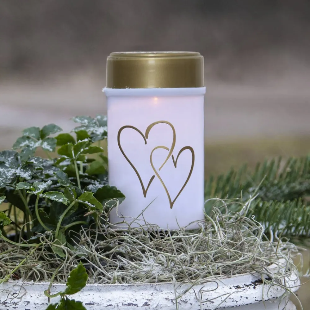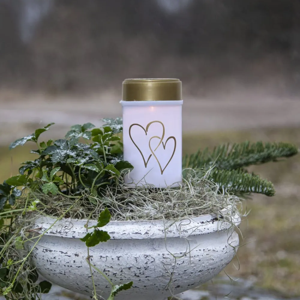 Hearty LED-gravlys med skumringskontakt og jordspyd Hearty er især beregnet til gravudsmykning. Det cylinderformede LED-gravlys er udformet som et klassisk gravlys med en krop af plast og et guldfarvet låg. Motivet af gyldne hjerter pryder ydersiden. Det stænktætte (IP44) LED-gravlys kan bruges permanent udendørs og er nemt at sætte fast takket være jordspyddet. Den drives af solceller og et genopladeligt batteri (medfølger). Den integrerede dagslyssensor muliggør automatisk skift baseret på den omgivende lysstyrke.