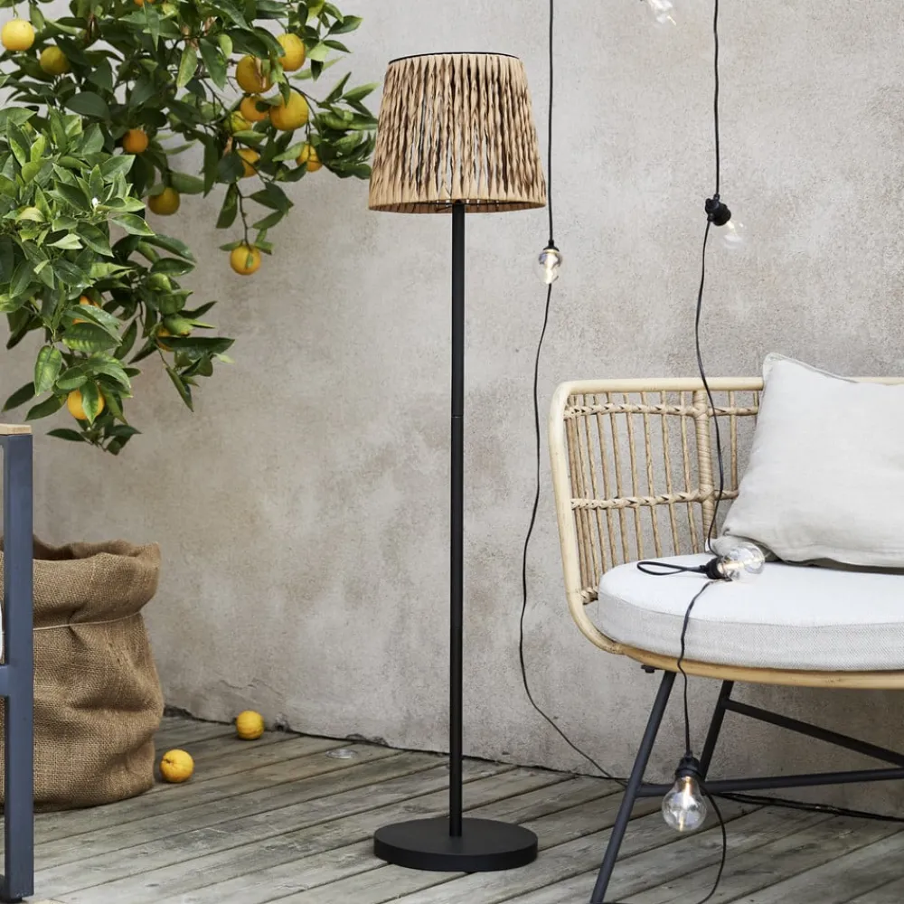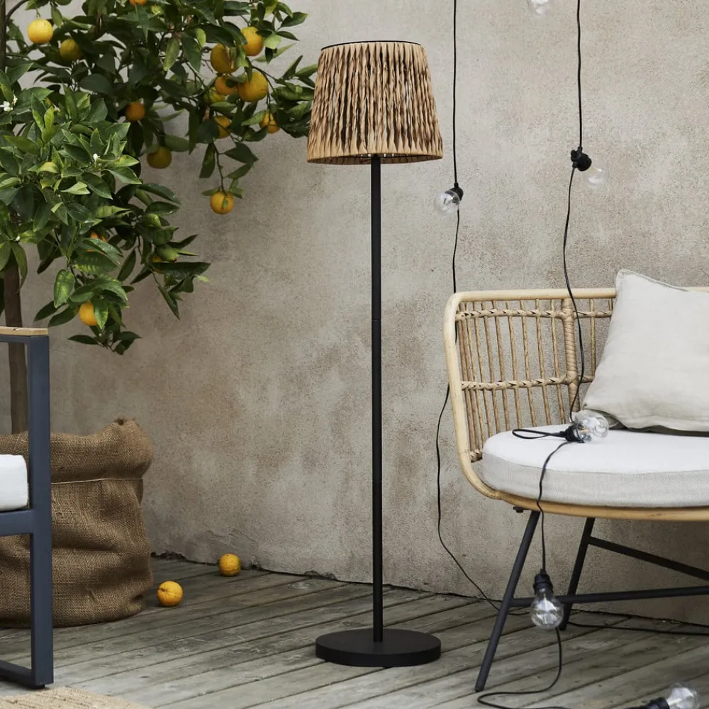 Solcelledrevet Cesta LED-gulvlampe med lampeskærm i rattan-look Cesta LED-gulvlampen er en trendy ekstra lyskilde til terrasser, balkoner og haver. Det sorte metalstel understøtter en lampeskærm med kegleform. Sidstnævnte er lavet af brun plast og er modelleret efter vævet rattan. Takket være solpanelet og det genopladelige batteri kræver Cesta-gulvlampen ingen strømtilslutning. Den kan tændes automatisk takket være en skumringssensor.