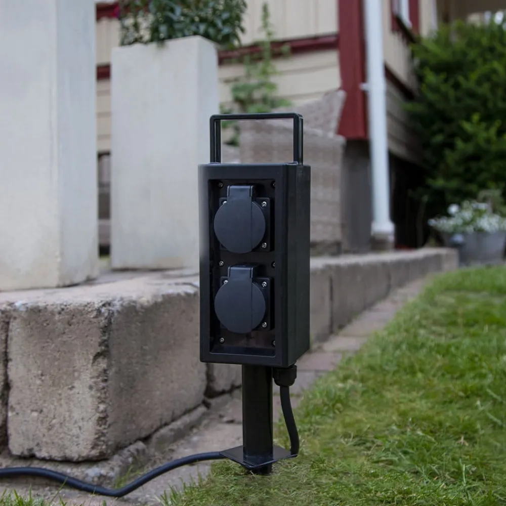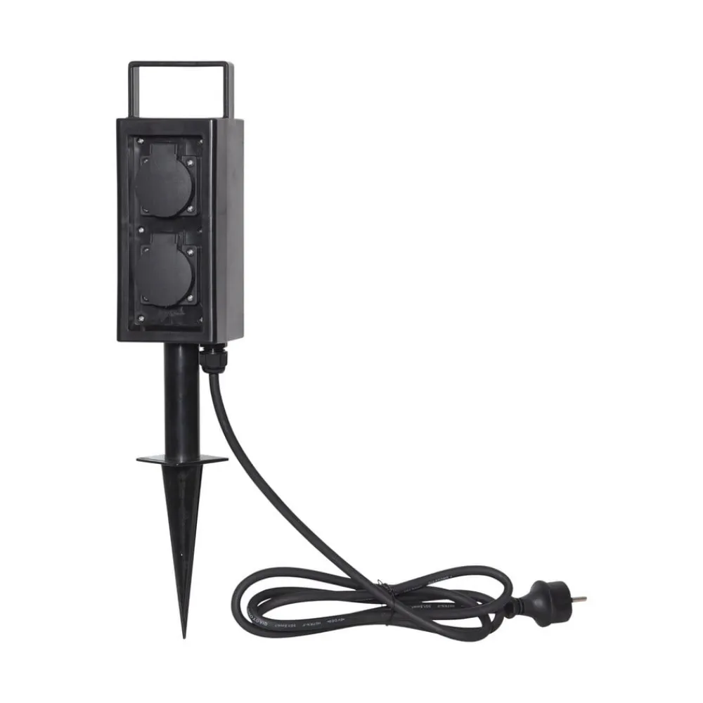 Plugge stikkontaktsøjle med fire udtag og 200 cm tilslutningskabel med stik Plugge firedobbelte udendørs stikkontakt kan hurtigt og nemt sættes i jorden på det ønskede sted takket være jordspyddet og er udstyret med et 200 cm kabel med stik til at forbinde den til en anden stikkontakt eller et forlængerkabel. Det giver en fleksibel tilslutningsmulighed til forsyning af elektriske apparater udendørs med en maksimal samlet effekt på 3860 W.