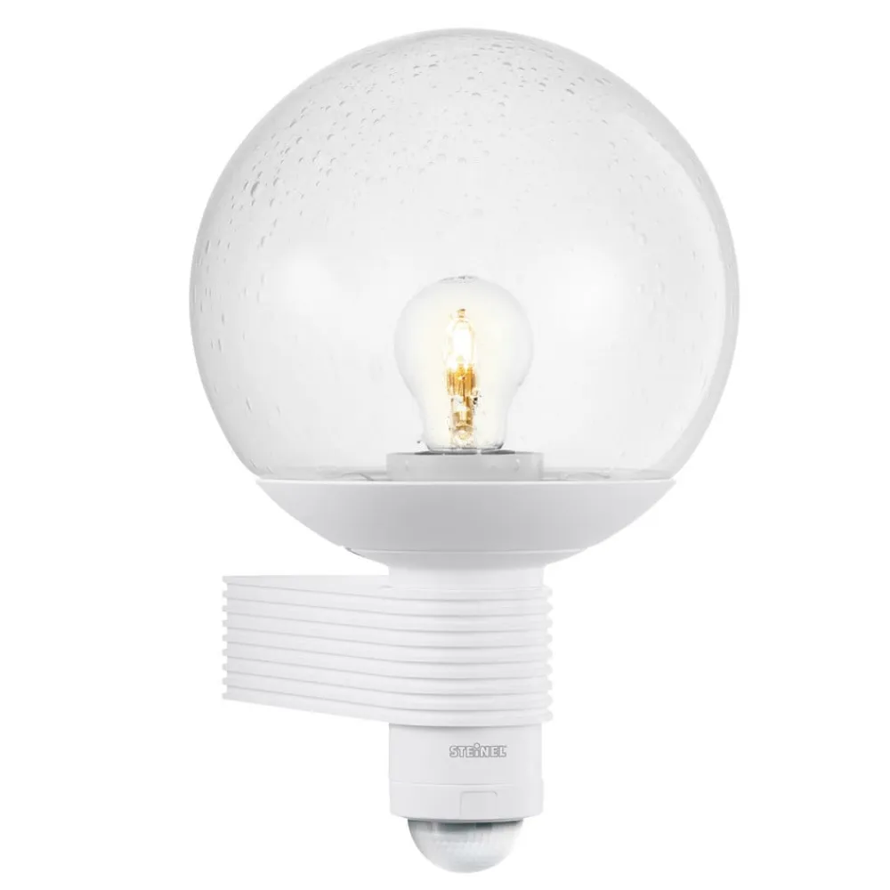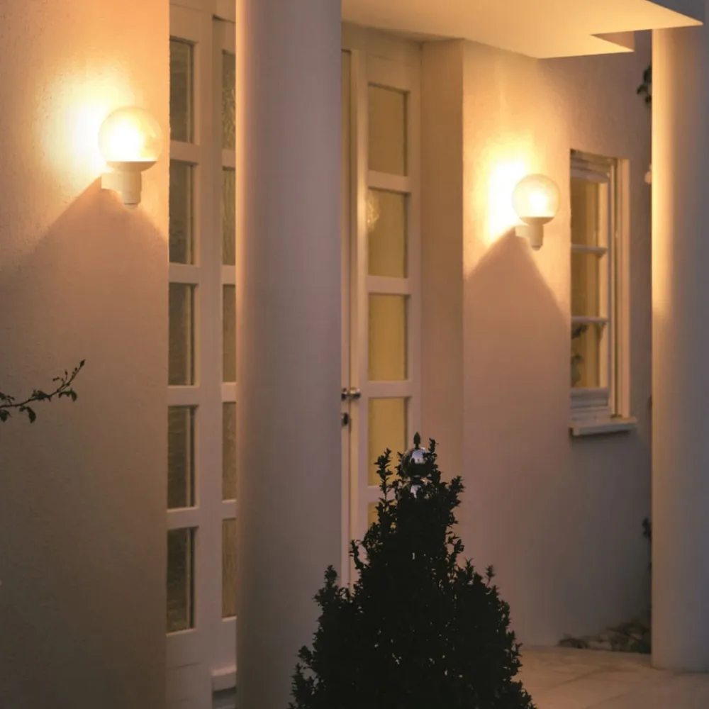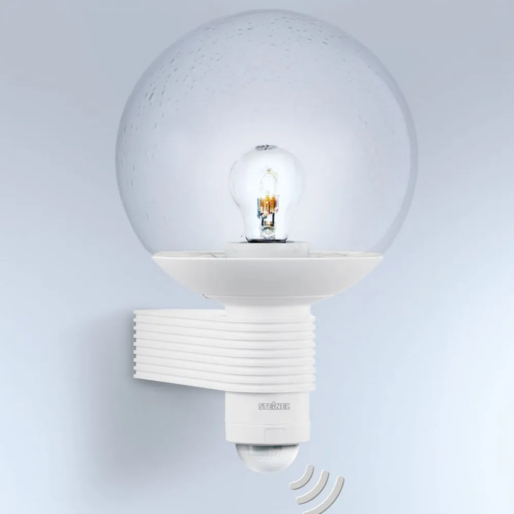 L 400 S: Sensor udendørs væglampe med kugleformet skærm af krystalglas Den udendørs væglampe L 400 S med bevægelsessensor udsender et fascinerende lys hele vejen rundt, der udstråler modernitet og stil, selv når den ikke er tændt, og som passer til mange facadedesigns. Udendørslampen har også en uovertruffen funktionalitet. Intet undslipper bevægelsessensoren på 240°. Registreringsområdet har en rækkevidde på en til tolv meter, som kan reduceres til 1 m ved hjælp af dækpladen. Det medfølgende dæksel kan skæres til. Tidsindstillingen kan varieres fra 10 sekunder til 15 minutter. Lysstyrken kan indstilles mellem 0 % og 50 %. Det mundblæste krystalglas skaber en særlig effektiv lysatmosfære. Rammen er lavet af vejrbestandig plast i et robust design. Med kapslingsgrad IP44 er armaturet også udstyret til at modstå barske vejrforhold – 180° åbningsvinkel – Sensorsystem: 5 detekteringsniveauer med 276 koblingszoner – Skumringsindstilling: 2 – 2.000 lux – Monteringshøjde maks. 6 m